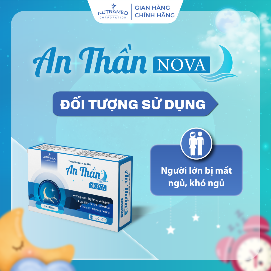 AN THẦN NO.VA - Giải pháp hỗ trợ an thần, cải thiện tình trạng mất ngủ, khó ngủ THÀNH PHẦN ️ Vông nem (Erythrina variegata); Lạc tiên (Passiflora foetida); Trinh nữ (Mimosa pudica); Nữ lang (Valeriana officinalis); Tâm sen (Nelumbium speciosum); Chiết xuất củ Bình vôi (Stephania glabra)   CÔNG DỤNG ️ Hỗ trợ an thần, giúp gây ngủ, hỗ trợ cải thiện tình trạng mất ngủ, khó ngủ.   ĐỐI TƯỢNG SỬ DỤNG ️ Người lớn bị mất ngủ, khó ngủ.     HƯỚNG DẪN SỬ DỤNG ️ Người lớn: uống 1 viên/lần x 2 lần/ngày. Nên uống trước khi ngủ 30 phút - 1 giờ.   KHÔNG SỬ DỤNG TRONG TRƯỜNG HỢP ️ Người đang vận hành máy móc, tàu xe. ️ Người mẫn cảm, kiêng kỵ với bất kỳ thành phần nào của sản phẩm.   LƯU Ý ️ Phụ nữ có thai, người đang dùng thuốc tham khảo ý kiến của chuyên gia y tế trước khi dùng. ️ Thực phẩm này không phải là thuốc, không có tác dụng thay thế thuốc chữa bệnh.   BẢO QUẢN  ️Nơi khô mát, tránh ánh nắng trực tiếp. Nhiệt độ không quá 30∘C. Tránh xa tầm tay trẻ nhỏ. THÔNG TIN SẢN PHẨM Tên sản phẩm: AN THẦN NO.VA Quy cách: Hộp 3 vỉ x 10 viên Hạn sử dụng: 36 tháng Tiêu chuẩn: TCCS   _ NUTRAMED - KHƠI NGUỒN KHOA HỌC TỚI CUỘC SỐNG   Nhà máy đạt chuẩn WHO – GMP. Nguyên liệu được kiểm tra chất lượng khắt khe bởi nhà máy đạt chuẩn GMP.