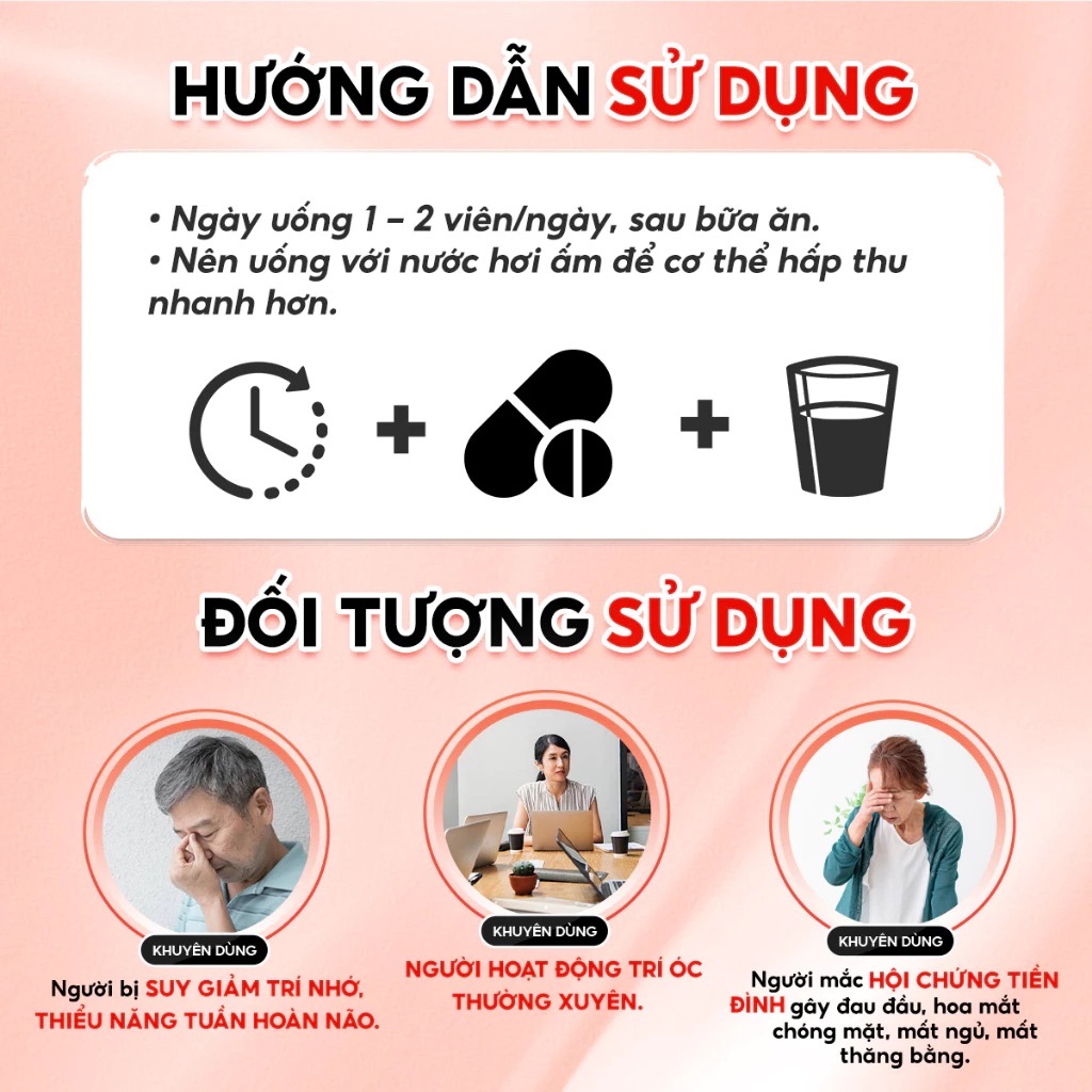 Thành phần Công dụng Hỗ trợ hoạt huyết, tăng cường tuần hoàn máu não, giảm các biểu hiện do thiểu năng tuần hoàn. Hỗ trợ giảm các di chứng sau tai biến mạch máu