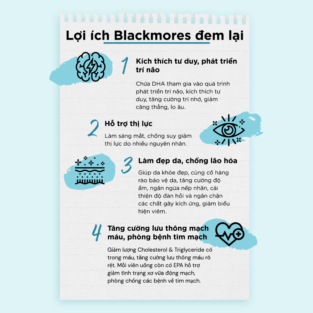 Blackmore Double Omega High Strength là sản phẩm viên uống dầu cá cô đặc chất lượng cao cung cấp lượng omega-3 gấp đôi so với dầu cá thông thường. Sản phẩm có thể sử dụng hằng ngày giúp tối ưu hóa sức khỏe, tăng thị lực, thúc đẩy tim, não và khớp khỏe mạnh.   THÔNG TIN CHI TIẾT Thành phần chính • Dầu cá Omega-3 1000mg cô đặc • 180 mg EPA và 120 mg DHA   Công dụng: • Duy trì sức khỏe tổng thể của tim – da – mắt – não. • Hỗ trợ phát triển trí não toàn diện, tăng cường tập trung, tăng cường trí nhớ cho người làm việc & học tập căng thẳng. • Giúp làm mềm mượt da và tóc, ngăn ngừa khô da. • Hỗ trợ làm giảm các chứng cứng cơ, đau khớp, sưng viêm khớp nhẹ. • Hỗ trợ cho đôi mắt thêm sáng khỏe, góp phần bảo vệ thị lực, tránh suy giảm thị lực.   Hướng dẫn sử dụng: • Người lớn: 1 viên mỗi ngày sau khi ăn, hoặc theo toa bác sĩ. • Trẻ em 6-12 tuổi: Dùng 1 viên mỗi ngày hoặc hỏi ý kiến bác sĩ trước khi dùng.   Lưu ý:  • Trẻ em từ 2-6 tuổi: Chỉ nên dùng khi có chỉ định của bác sĩ. • Sản phẩm này phông phải là ố, không có tác dụng thay thế ố chữa bệnh.   Hướng dẫn bảo quản: • Nơi khô ráo, thoáng mát. • Tránh ánh nắng trực tiếp, nơi có nhiệt độ cao hoặc ẩm ướt. • Đậy nắp kín sau khi sử dụng.   Quy cách đóng gói: Lọ 90 viên   Xuất xứ: Úc Nơi sản xuất: Úc Ngày sản xuất: Xem trên bao bì sản phẩm Hạn sử dụng: 48 tháng kể từ ngày sản xuất   THÔNG TIN THƯƠNG HIỆU: Blackmores là công ty dẫn đầu trong lĩnh vực chăm sóc sức khoẻ từ thiên nhiên của Úc được thành lập vào năm 1930. Dựa trên tầm nhìn và niềm đam mê của ông Maurice Blackmore – người sáng lập thương hiệu – Blackmores luôn nỗ lực tạo ra những sản phẩm bảo vệ sức khỏe từ các loại thảo mộc tự nhiên. Không chỉ gây ấn tượng về bề dày lịch sử và sự phát triển ổn định của công ty, Blackmores còn nỗ lực tạo ra nhiều hơn giá trị cộng đồng như bảo vệ môi trường, hỗ trợ cho cộng đồng, thúc đẩy tư duy đầu tư để có một cơ thể khỏe mạnh. Đến nay, Blackmores vẫn không ngừng nghiên cứu, tìm tòi để phát triển các sản phẩm mới nhằm mang đến sự chăm sóc tốt hơn cho sức khỏe khách hàng.