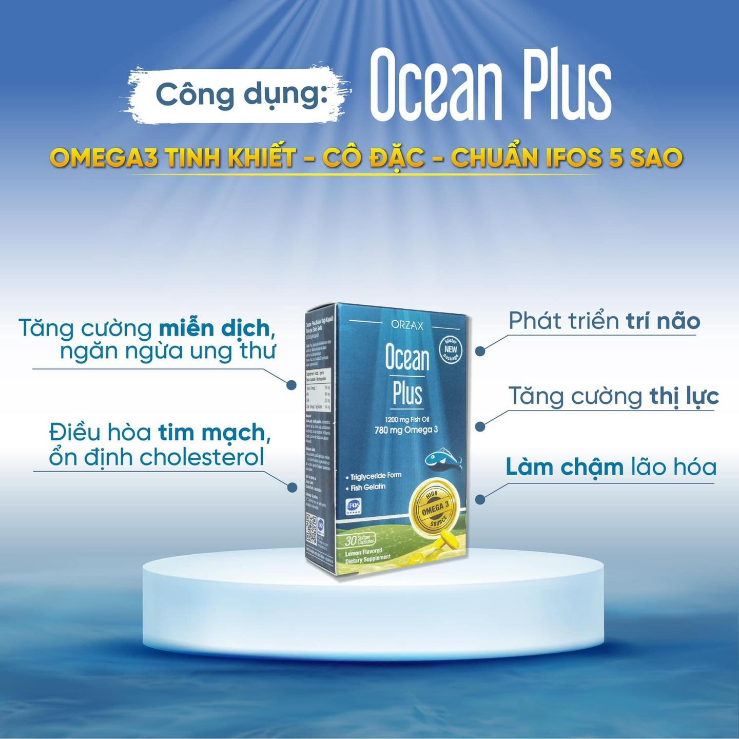 Thành phần của Ocean Plus Thành phần trong một viên nang 1,677g : Dầu cá 1197,6mg. Thành phần phụ: Gelatin từ cá: 286 mg; Chất làm ẩm (glycerol): 131,2 mg; Nước tinh khiết: 47,8 mg, Tinh dầu chanh: 12 mg; Chất chống oxy hóa (chiết xuất giàu tocopherol - Vitamin E): 2,4 mg; Glycerol sử dụng trong viên nang có nguồn gốc từ thực vật. Công dụng của Ocean Plus Bổ sung acid béo Omega 3 bổ não, bổ mắt, tăng cường sức khỏe tim mạch và xương khớp. Đối tượng của Ocean Plus Trẻ em trên 11 tuổi, người trưởng thành, người già, phụ nữ chuẩn bị có thai, đang trong giai đoạn mang thai và cả trong giai đoạn cho con bú. Liều dùng của Ocean Plus 1-2 viên/ ngày sau khi ăn. Lưu ý của Ocean Plus Giữ xa tầm tay trẻ em. Không dùng quá lượng sử dụng khuyến cáo cho mỗi ngày. Phụ nữ có thai và cho con bú, và người đang bị bệnh hoặc đang dùng thuốc đi.ều ị bệnh nên sử dụng sản phẩm theo tư vấn và hướng dẫn của bác sĩ. Thực phẩm bảo vệ sức khỏe này không thể thay thế cho chế độ dinh dưỡng thông thường. Tham khảo ý kiến bác sĩ nếu bạn đang dùng thuốc ch.ống đô máu. Thực phẩm này không phải là thuốc, không có tác dụng thay thế thuốc ch.ữa bệnh. Bảo quản của Ocean Plus Nơi khô ráo, thoáng mát, nhiệt độ dưới 25 độ C.