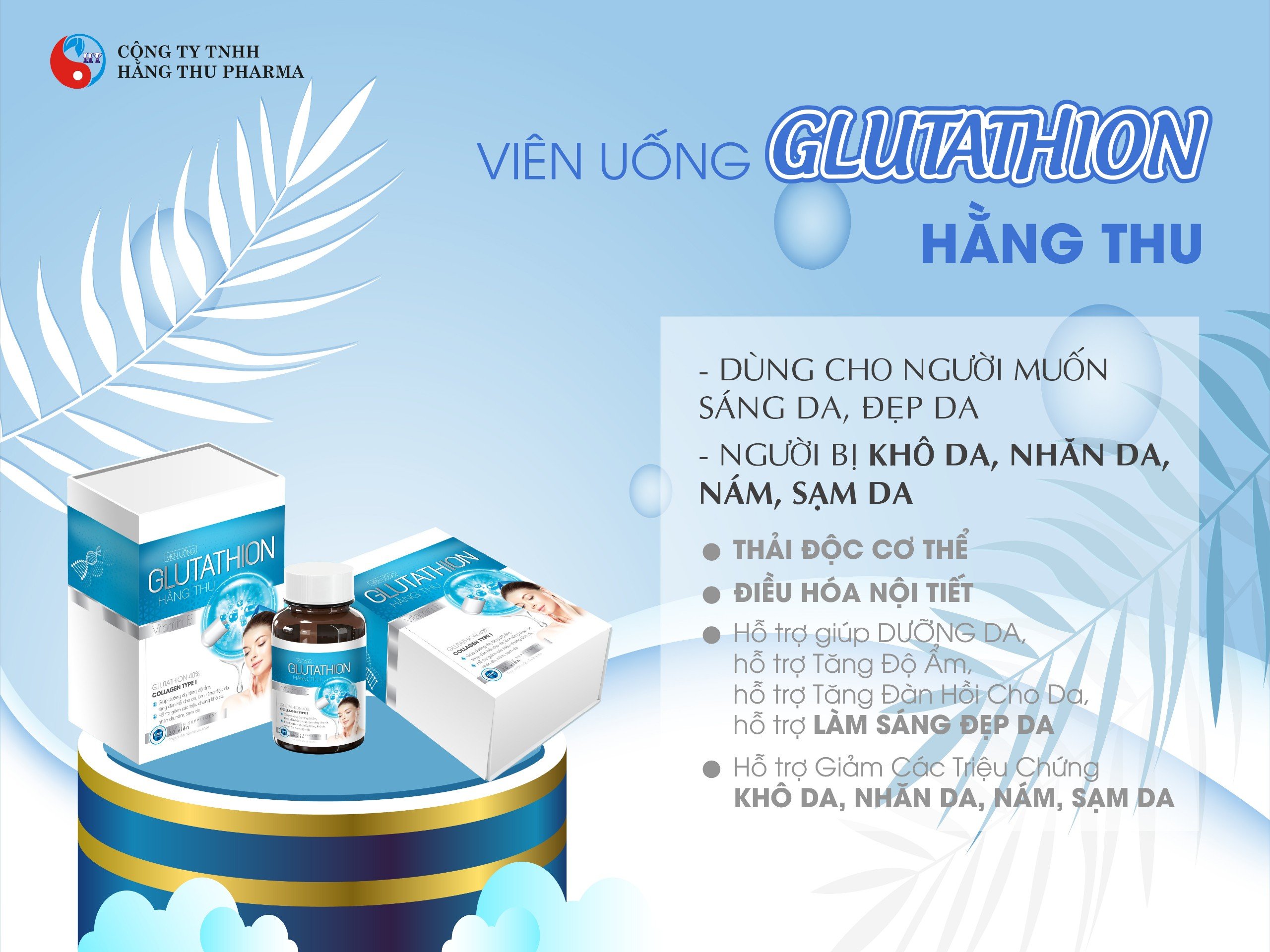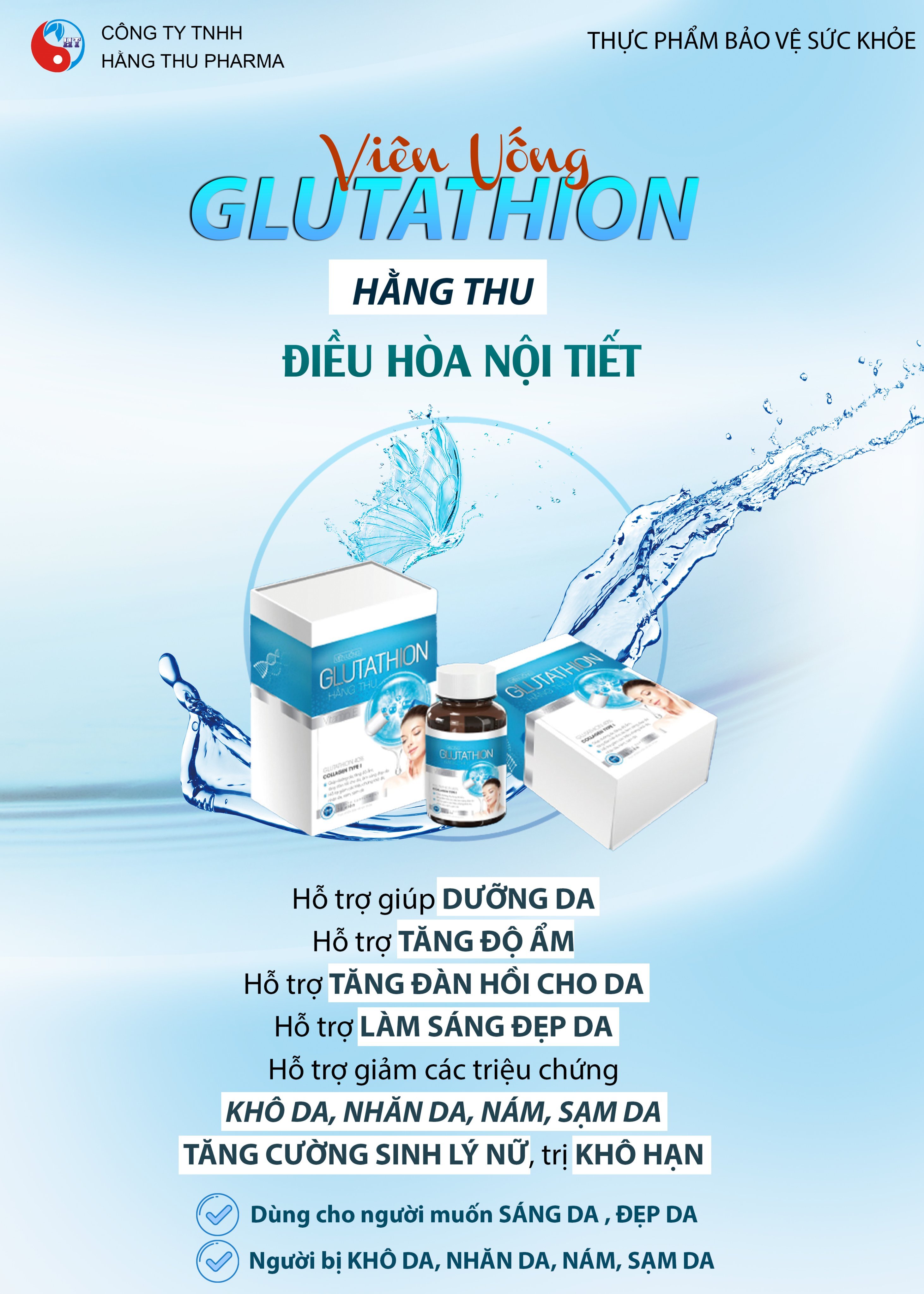Sản phẩm Viên uống Glutathion Hằng Thu điều hòa nội tiết Giới thiệu Sản phẩm điều hòa nội tiết và làm đẹp da, trắng da, mờ nhám, hết mụn - được Bộ Y Tế kiểm định chất lượng và công bố sản phẩm đảm bảo chất lượng. Hiệu quả đã được chứng minh, rất nhiều phụ nữ dùng và giới thiệu cho bạn bè người thân sử dụng. Công Dụng Các Thành Phần Của Glutathion Hằng Thu Glutathion 40%: Làm chậm quá trình lão hóa da. Giúp da trắng sáng. Thải độc và tăng cường chức năng gan. Tăng cường miễn dịch. Hỗ trợ giảm đau cơ và khớp.