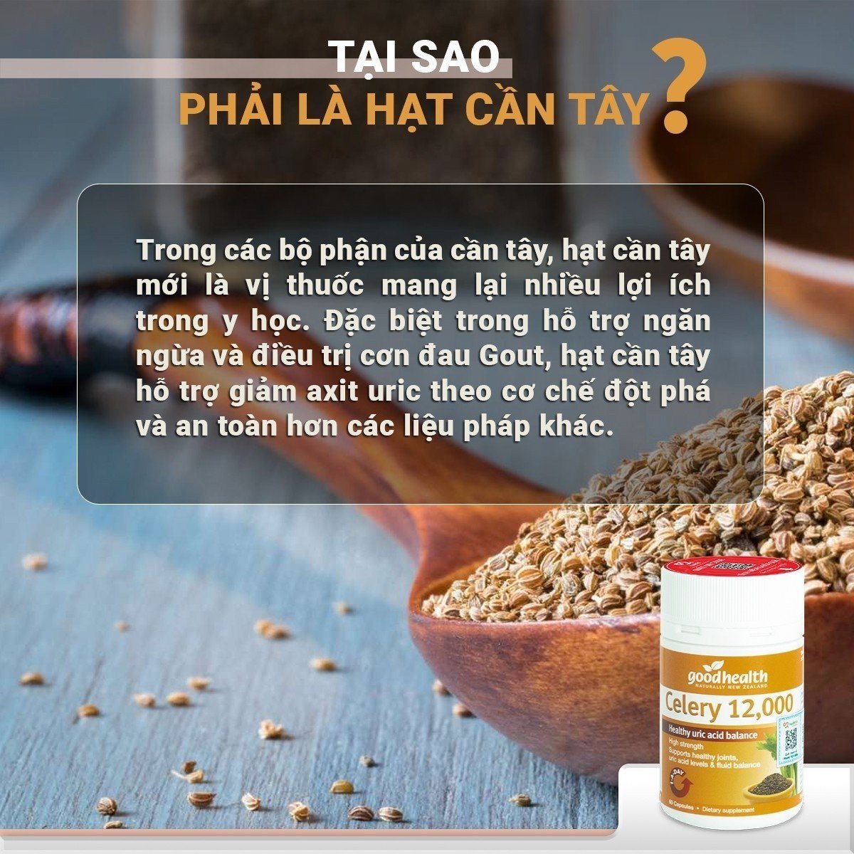 - ĐẶC ĐIỂM NỔI BẬT Goodhealth Celery 12000 được chiết xuất 100% thảo dược tươi nguyên chất, đặc biệt là từ hạt giống cần tây, có tác dụng hỗ trợ trong việc làm giảmcác triệu chứng của bệnh Gout, viêm khớp và thấp khớp, chống viêm, và lợi tiểu.