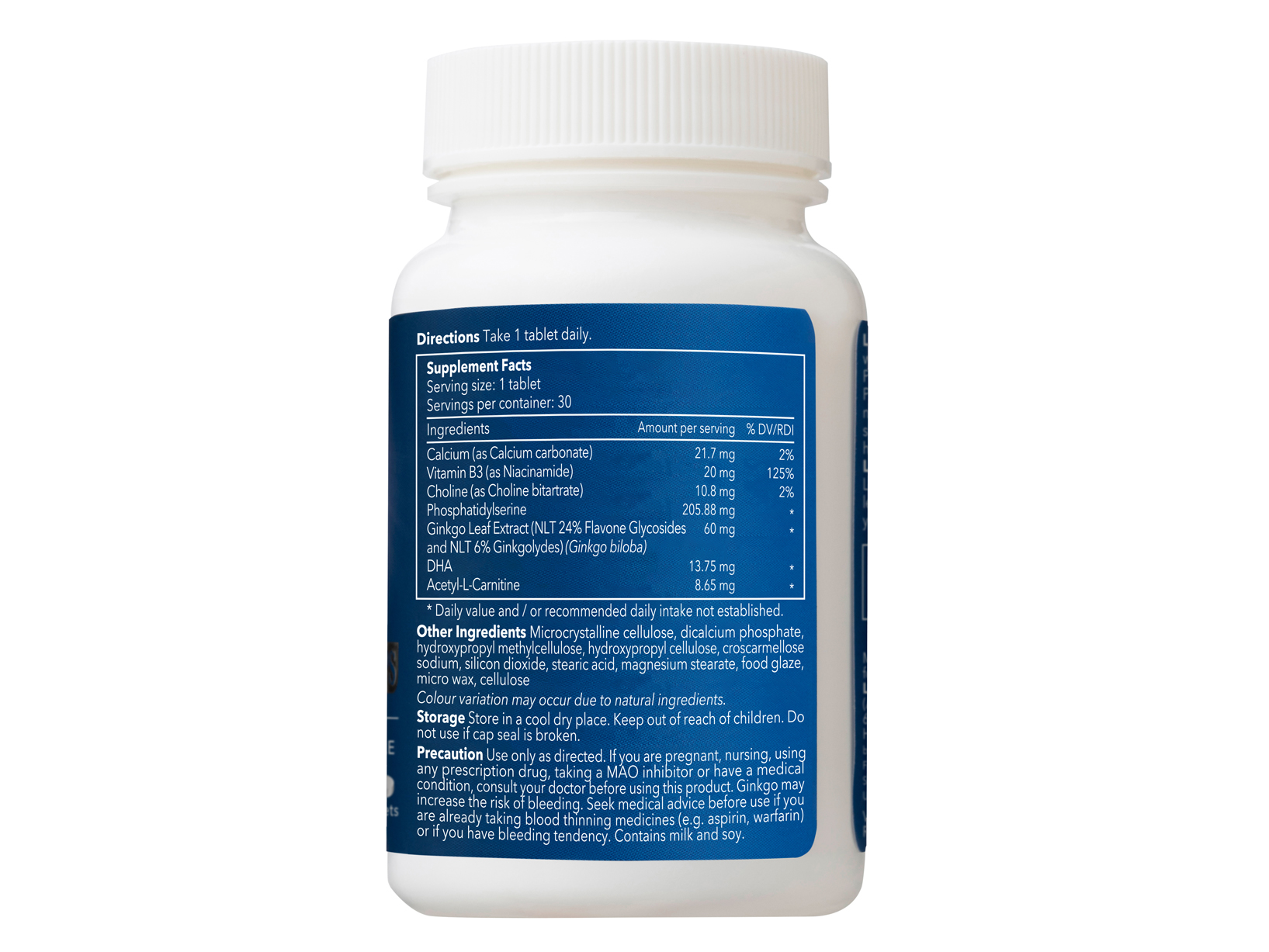 Thành phần: Ginkgo Biloba: 240mg Cafein: 5mg Magnesium: 60mg Vitamin B1: 6mg Vitamin B6: 6mg Công dụng: giúp tăng cường trí nhớ, giúp trí não minh mẫn, nhanh nhẹn, cải thiện triệu chứng liên quan