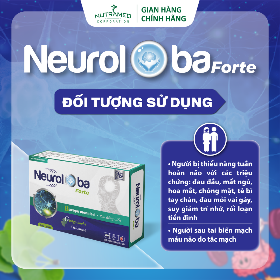 NEUROLOBA - Hỗ trợ tuần hoàn máu não, cải thiện các triệu chứng sau tai biến mạch máu não   THÀNH PHẦN ️Bacopa monnieri extract (cao chiết rau đắng biển Ấn Độ), Ginkgo biloba extract (cao chiết lá cây bạch quả), Phosphatidylserine, Withania somnifera extract (cao chiết sâm Ấn Độ), Citicoline, Tá dược.   CÔNG DỤNG ️Hỗ trợ tăng cường tuần hoàn máu não. ️Giúp cải thiện các triệu chứng hoa mắt, chóng mặt, tê bì chân tay, đau mỏi vai gáy, suy giảm trí nhớ do thiểu năng tuần hoàn não. ️Hỗ trợ cải thiện các triệu chứng sau tai biến mạch máu não do tắc mạch.   ĐỐI TƯỢNG SỬ DỤNG ️Người gặp vấn đề thiểu năng tuần hoàn não có triệu chứng các triệu chứng hoa mắt, chóng mặt, tê bì chân tay, đau mỏi vai gáy, suy giảm trí nhớ ️Người sau tai biến mạch máu não      HƯỚNG DẪN SỬ DỤNG ️Uống ngày 2 - 3 lần, mỗi lần 1 viên, uống sau khi ăn 1 - 2 giờ.    KHÔNG SỬ DỤNG TRONG TRƯỜNG HỢP ️Người mẫn cảm, kiêng kỵ với bất kỳ thành phần nào của sản phẩm. ️Trẻ em dưới 12 tuổi ️Phụ nữ có thai và phụ nữ đang trong kỳ kinh nguyệt ️Người có vết thương hở, đang bị chảy máu ️Người tăng huyết áp kịch phát, xuất huyết não ️Người vừa phẫu thuật, chuẩn bị phẫu thuật   LƯU Ý ️Người đang dùng thuốc tham khảo ý kiến của chuyên gia y tế trước khi dùng. ️Thực phẩm này không phải là thuốc, không có tác dụng thay thế thuốc chữa bệnh.   BẢO QUẢN  ️Nơi khô mát, tránh ánh nắng trực tiếp. Nhiệt độ không quá 30∘C. Tránh xa tầm tay trẻ nhỏ.   THÔNG TIN SẢN PHẨM Tên sản phẩm: Neuroloba Forte Quy cách: Hộp 3 vỉ x 10 viên Hạn sử dụng: 36 tháng Tiêu chuẩn: TCCS   _ NUTRAMED - KHƠI NGUỒN KHOA HỌC TỚI CUỘC SỐNG   Nhà máy đạt chuẩn WHO – GMP. Nguyên liệu được kiểm tra chất lượng khắt khe bởi nhà máy đạt chuẩn GMP.