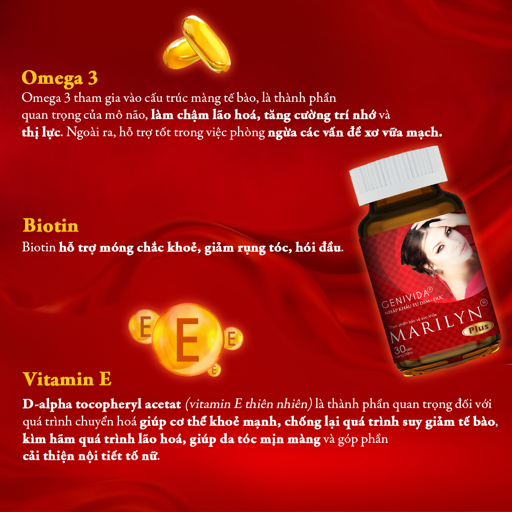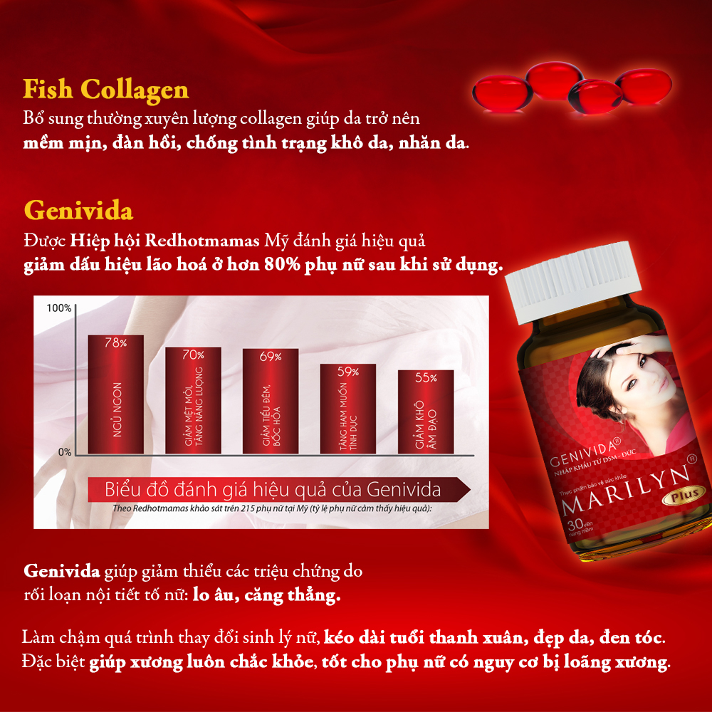 Mua tại TiktokVIÊN UỐNG CÂN BẰNG NỘI TIẾT TỐ, CẢI THIỆN SINH LÝ NỮ MARILYN PLUS Với sự kết hợp giữa các thành phần cải thiện nội tiết tố nữ và làm đẹp da cao cấp, Viên uống Cân Bằng Nội Tiết Tố, Cải Thiện Sinh Lý Marilyn là giải pháp hàng đầu dành cho phụ nữ trong giai đoạn tiền mãn kinh, mãn kinh, phụ nữ sau sinh và rối loạn nội tiết tố nữ. Không chỉ cải thiện sinh lý nữ, sản phẩm còn giảm thiểu các triệu chứng của tiền mãn kinh, mãn kinh như mất ngủ, bốc hỏa, rụng tóc, lo â, đồng thời làm đẹp da, mờ thâm nám và bảo vệ tim mạch. *Bao bì sản phẩm có thể thay đổi theo từng đợt nhập hàng HIỆU QUẢ RÕ RỆT CHỈ SAU 45 NGÀY SỬ DỤNG! GENIVIDA BÍ MẬT TẠO NÊN SỨC QUYẾN RŨ CỦA PHÁI ĐẸP