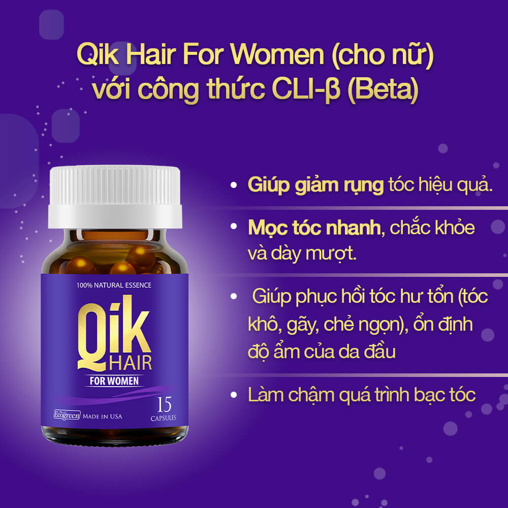 - CÔNG DỤNG Qik (For Women) với công thức chuyên biệt cho nữ giới, chứa các tinh chất thiên nhiên, giúp hỗ trợ cân bằng hệ thần kinh nội tiết và tăng trưởng tế bào mầm tóc:
