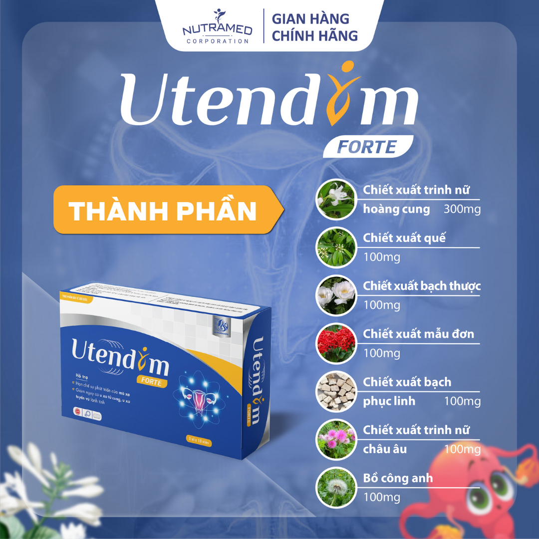 UTENDIM - Giúp giảm nguy cơ u xơ tử cung, u xơ tuyến vú THÀNH PHẦN ️Chiết xuất Trinh nữ hoàng cung; Chiết xuất Quế; Chiết xuất Bạch thược; Chiết xuất mẫu đơn; Chiết