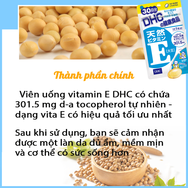 - Thực phẩm bảo vệ sức khỏe DHC Natural Vitamin E (soybean) có chứa tới 301,5mg vitamin E hoạt tính cao dưới dạng d-alpha tocopherol được chiết xuất hoàn toàn tự nhiên từ đậu nành.