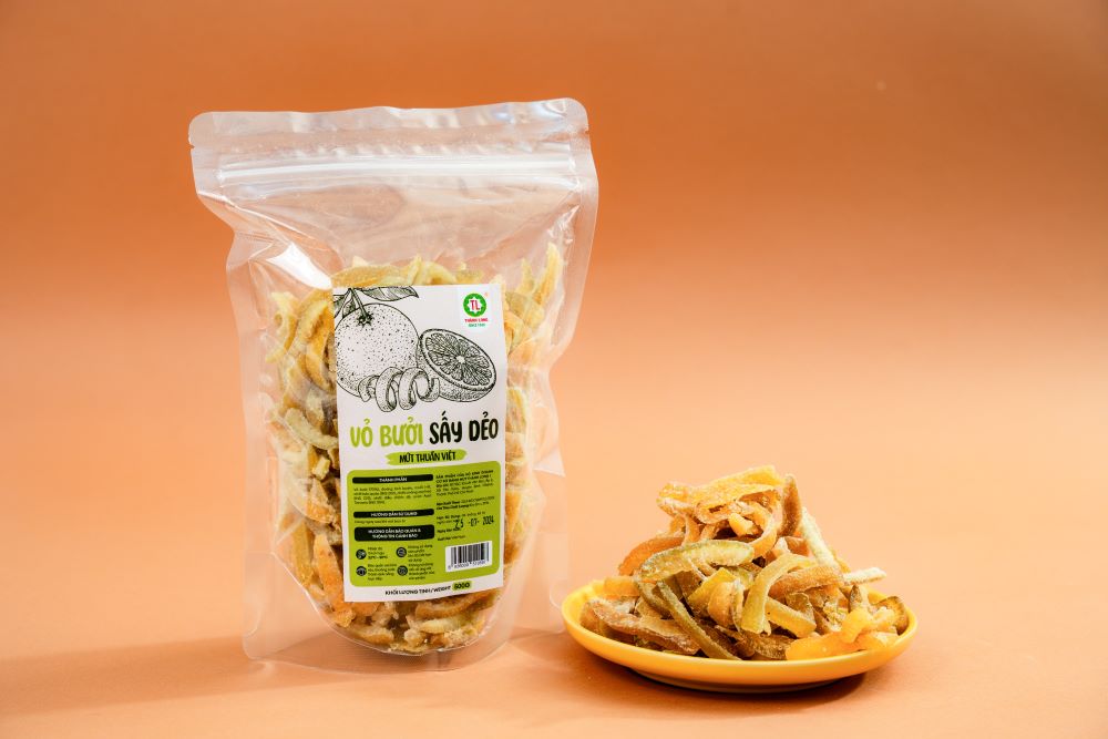 VỎ BƯỞI SẤY DẺO Mứt Thuần Việt THÀNH PHẦN : Vỏ Bưởi (70%), đường tinh luyện, muối i-ốt, chất bảo quản (E202), chất chống oxy hóa (E223), chất điều chỉnh độ acid: Acid Tartaric (E334) SẢN XUẤT THEO: 02/HKDCSBMTL1/2021 THỜI HẠN SỬ DỤNG : 06 Tháng kể từ ngày sản xuất CHỈ TIÊU CHẤT LƯỢNG : ĐỘ ẨM ≤ 35% HƯỚNG DẪN SỬ DỤNG VÀ BẢO QUẢN: HƯỚNG DẪN BẢO QUẢN: BẢO QUẢN NƠI KHÔ RÁO, THOÁNG MÁT. TRÁNH ÁNH NẮNG TRỰC TIẾP. NHIỆT ĐỘ THÍCH HỢP: 220C-300C HƯỚNG DẪN SỬ DỤNG: DÙNG NGAY SAU KHI MỞ BAO BÌ. THÔNG TIN CẢNH BÁO: KHÔNG SỬ DỤNG SẢN PHẨM KHI ĐÃ HẾT HẠN SỬ DỤNG GIẤY CHỨNG NHẬN HACCP SỐ 21.4256 – HACCP/VC DO TRUNG TÂM GIÁM ĐỊNH VÀ CHỨNG NHẬN HỢP CHUẨN HỢP QUY VIETCERT ĐÁNH GIÁ CHỨNG NHẬN PHÙ HỢP TIÊU CHUẨN. BAO BÌ THAY ĐỔI THEO TỪNG LÔ HÀNG.