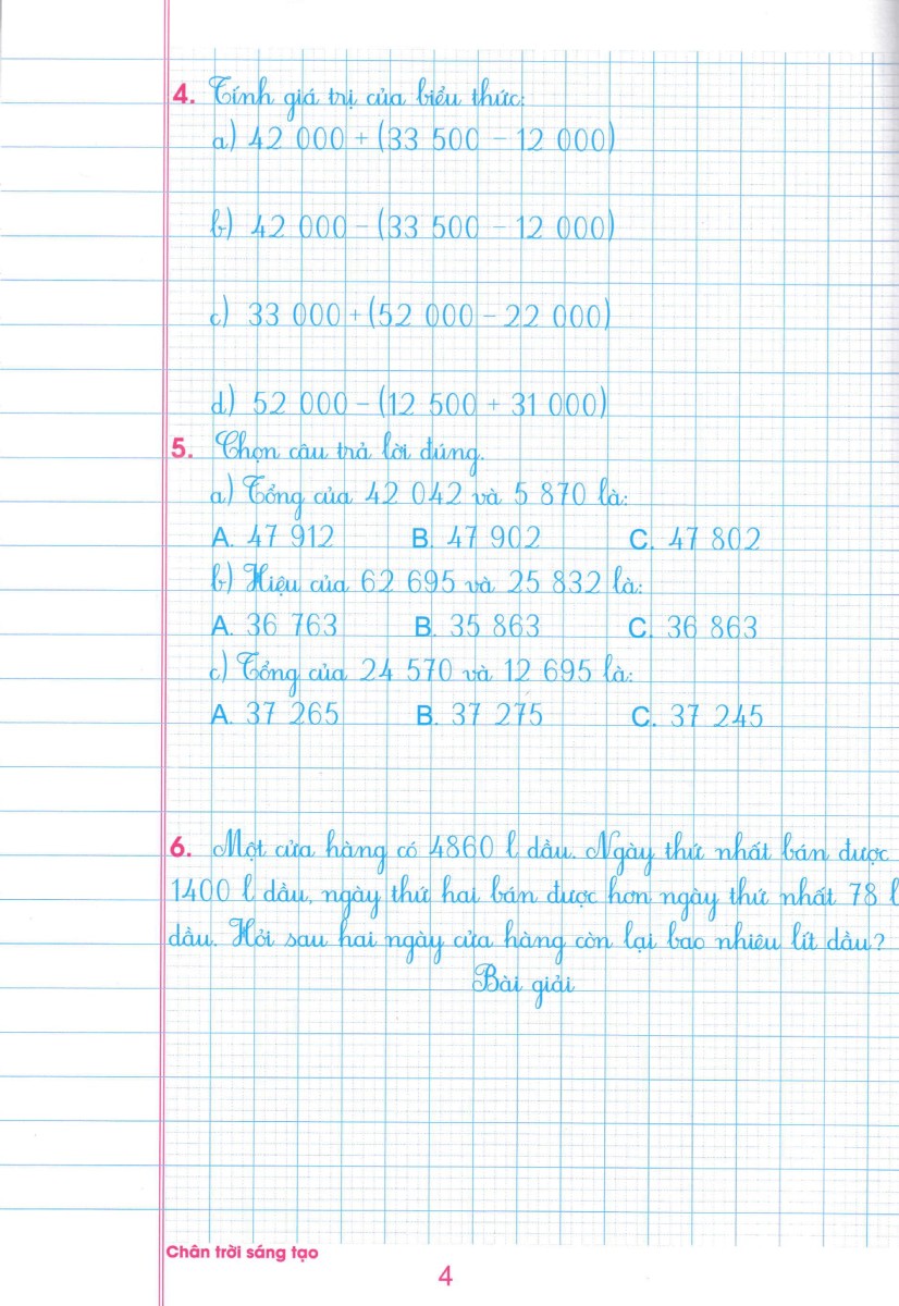Vở ô li bài tập toán 4 - quyển 1 được biên soạn theo chương trình SGK chân trời sáng tạo, giúp các em tự học tại nhà một cách hiệu quả. Đặc biệt, hình thức vở kẻ ô li giúp các em rèn viết chữ sạch, đẹp, trình bày rõ ràng. Đây là tài liệu bổ ích giúp các em học sinh học tốt chương trình Toán trên lớp.