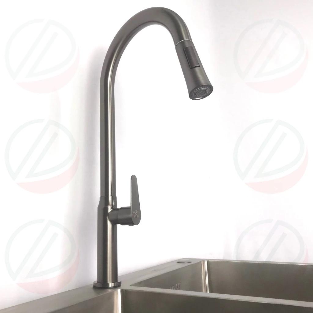 Mã sản phẩm: Artan Grey – Hình dáng: Vòi thiết kế bo tròn, đầu vòi ngang. Tay vòi ngang – Chức năng: Nóng lạnh + Rút dây + 2 chức năng Sprayer (Phun hoa sen,