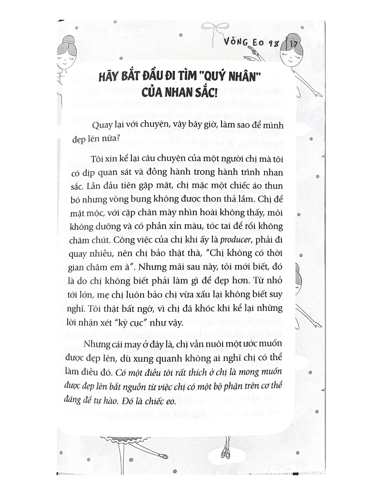 Vậy nên, cuốn sách này có tựa đề VÒNG EO 98 -VẺ ĐẸP KHÔNG HOÀN HẢO với tinh thần cổ vũ, khích lệ, sẽ không có những rào cản, mặc cảm, dằn vặt hay trách cứ bản thân. Cuốn sách muốn lan truyền thông điệp về cách sống tích cực và trước tiên: Bạn phải là chính mình.”