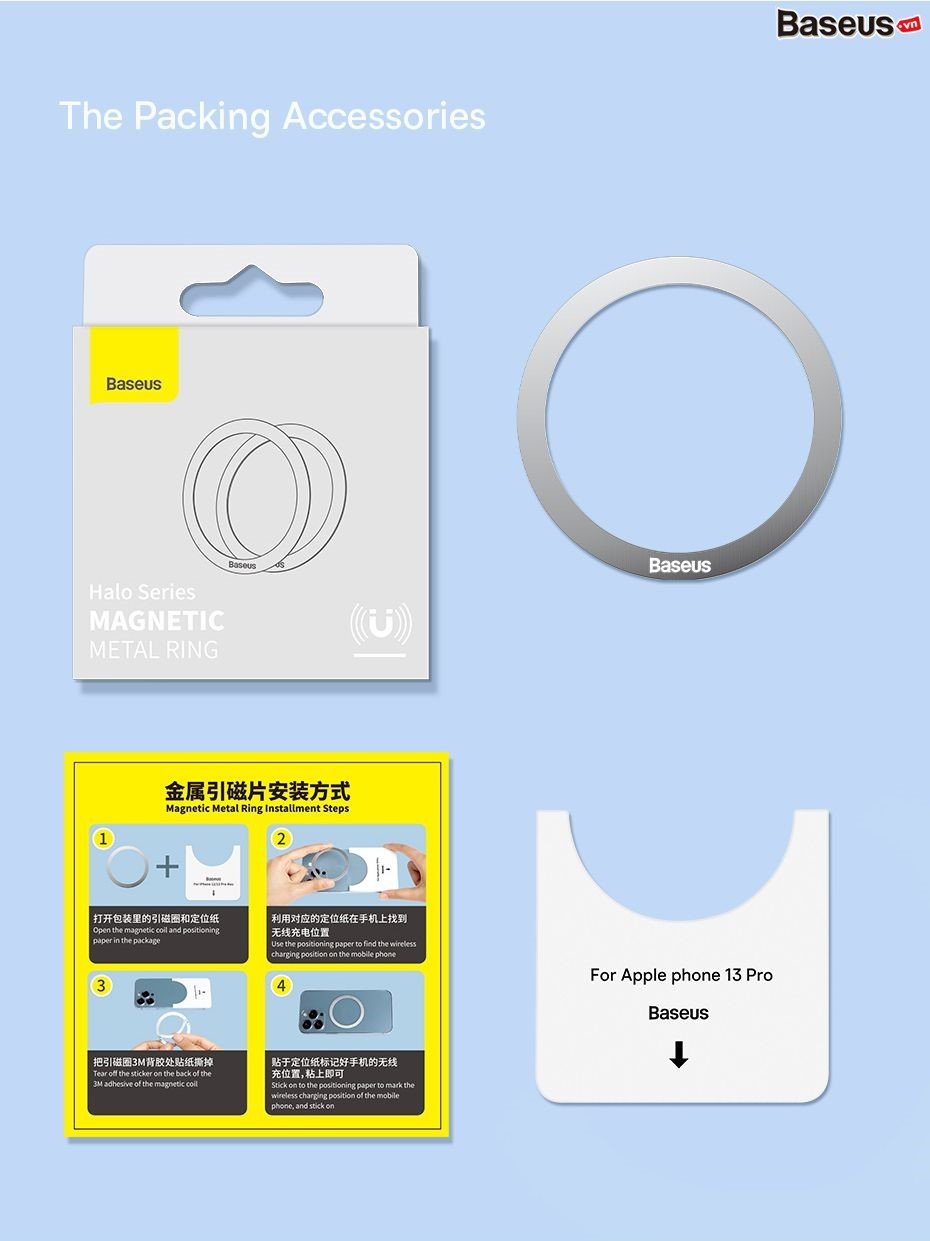 Giới thiệu sản phẩm Vòng kim loại mag-safe Baseus Halo Series Magnetic Metal Ring cho điện thoại Tính năng độc đáo và tiện ích nhất trên dòng iP 12/ 13 Series là khi sử dụng cùng hệ sinh thái các phụ kiện chuẩn Mag-Safe của Ap-ple. Tuy nhiên nếu bạn đang sử dụng các loại ốp lưng bảo vệ sẽ làm giảm đáng kể lực hút của mặt lưng i-Phone với các phụ kiện Mag-Safe này (thậm chí khi lực hút yếu các đế sạc không dây chỉ nhận sạc thông thường mà không nhận được chuẩn sạc không dây Mag-Safe). Điều này làm giảm đáng kể trải nghiệm và hiệu quả sử dụng của các loại phụ kiện Mag-Safe. Hoặc bạn đang sở hữu các dòng i-Phone 11 (hoặc cũ hơn)/ Smart-phone And-roid như Sam-sung/ Hua-wei/ OPPO Xiao-mi nhưng lại muốn sử dụng với các loại phụ kiện Mag-Safe hoặc các đế sạc không dây bằng nam châm nhưng không tương thích do mặt lưng không được trang bị nam châm. Trong trường hợp này bạn chỉ cần trang bị Bộ vòng kim loại Mag-safe Baseus Halo Series Magnetic là có thể khắc phục hiệu quả tất cả các nhược điểm nói trên. Chi tiết sản phẩm Vòng kim loại mag-safe Baseus Halo Series Magnetic Metal Ring cho điện thoại