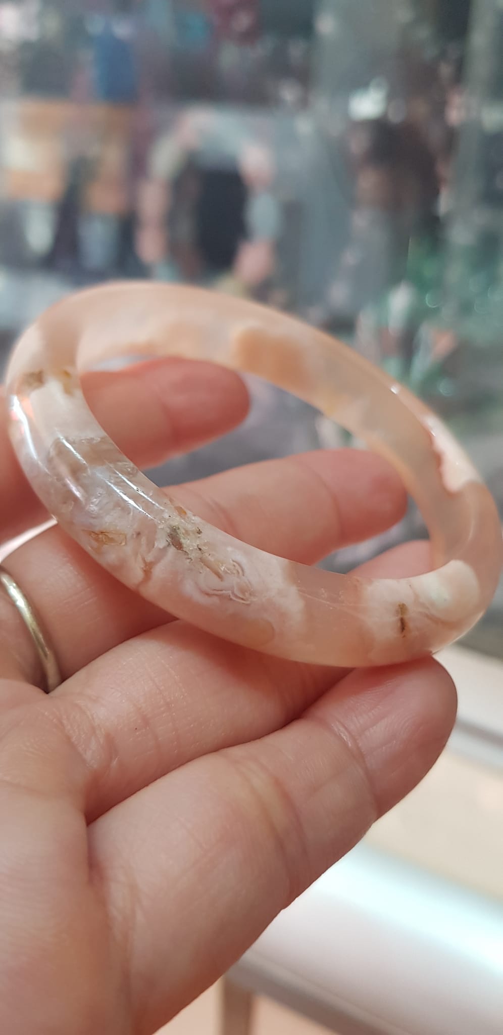 ✨Vòng tay Nữ Bản Hẹ Mới Đá Mã Não Bông Tuyết Hồng nhẹ trắng trong bóng quá đẹp luôn ạ Vòng Ni 53mm x Cao 11mm x dầy 7mm Nữ Cân nặng 52kg - 55kg đeo xinh tay đẹp lắm ạ