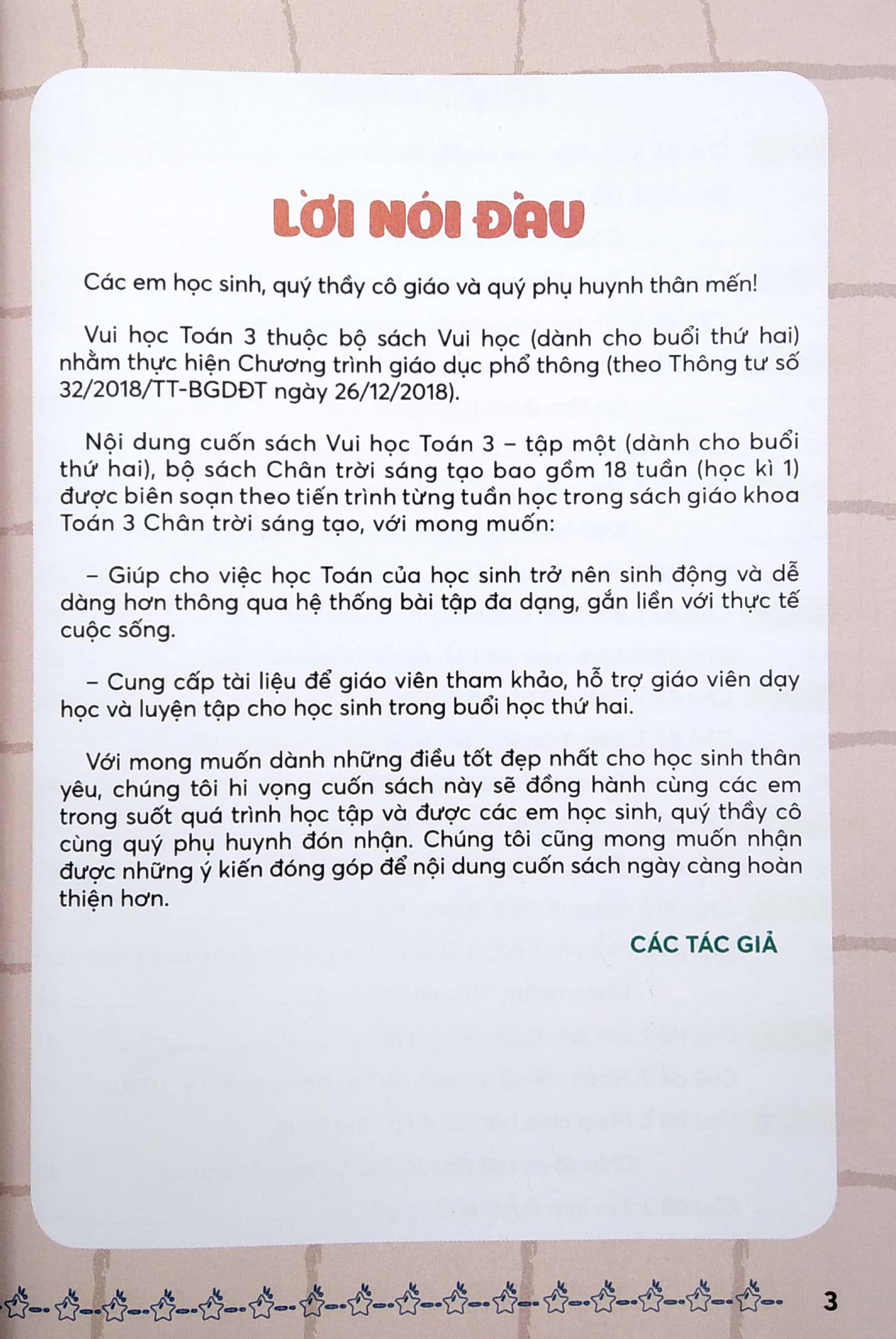 Nội dung cuốn sách Vui Học Toán 3 - Tập 1 (dành cho buổi thứ hai), bộ sách Chân trời sáng tạo bao gồm 18 tuần (học kì 1) được biên soạn theo tiến trình từng tuần học trong sách giáo khoa Toán 3 Chân trời sáng tạo, với mong muốn: