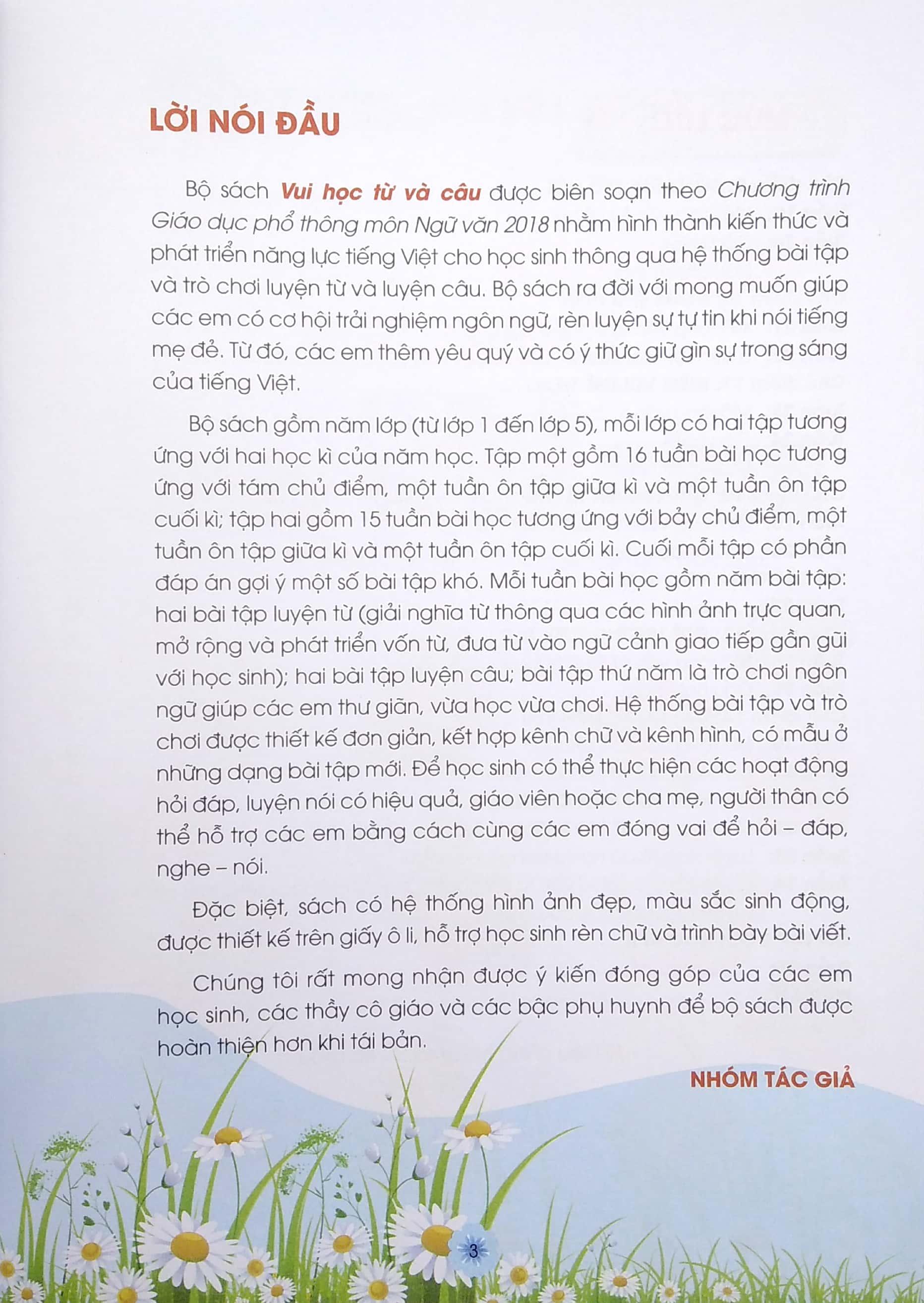 Bộ sách Vui học từ và câu được được biên soạn theo Chương trình giáo dục phổ thông môn Ngữ văn 2018 nhằm hình thành kiến thức và phát triển năng lực tiếng Việt cho học sinh thông qua hệ thống bài tập và trò chơi luyện từ và luyện cầu. Bộ Sách với mong muốn giúp các em có cơ hội trải nghiệm ngôn ngữ, rèn luyện sự tự tin khi nói tiếng mẹ đẻ. Từ đó, các em thêm yêu quý và có ý thức giữ gìn sự trong sáng của tiếng Việt.