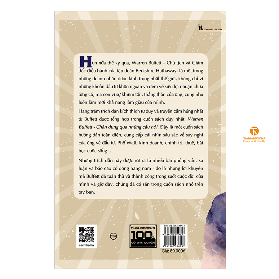 Những trích dẫn này được rút ra từ nhiều bài phỏng vấn, xã luận và báo cáo cổ đông hàng năm – đó là những lời khuyên mà Buffett đã tuân thủ và thành công trong suốt cuộc đời của mình và giờ đây, chúng đã có sẵn trong cuốn sách nhỏ trên tay bạn.