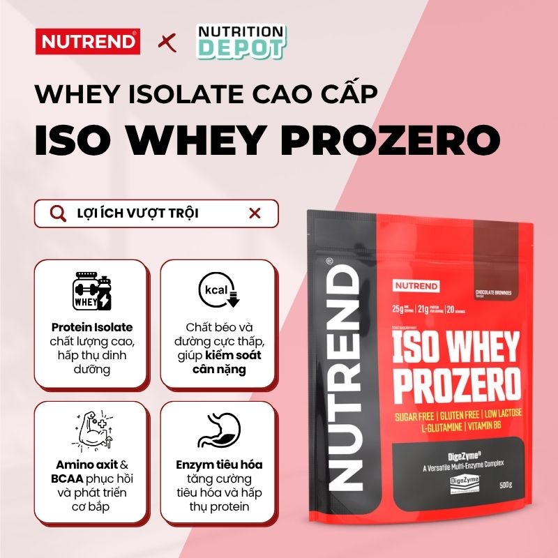 - Nutrend ISO WHEY Prozero với thành phần từ 100% whey Isolate chất lượng cao, không chứa đường, không gluten và rất ít lactose hỗ trợ xây dựng và tăng trưởng cơ bắp tối ưu, phù hợp ngay cả với những người ăn kiêng ít carbohydrate và người có vấn để về lactose trong sữa bò.