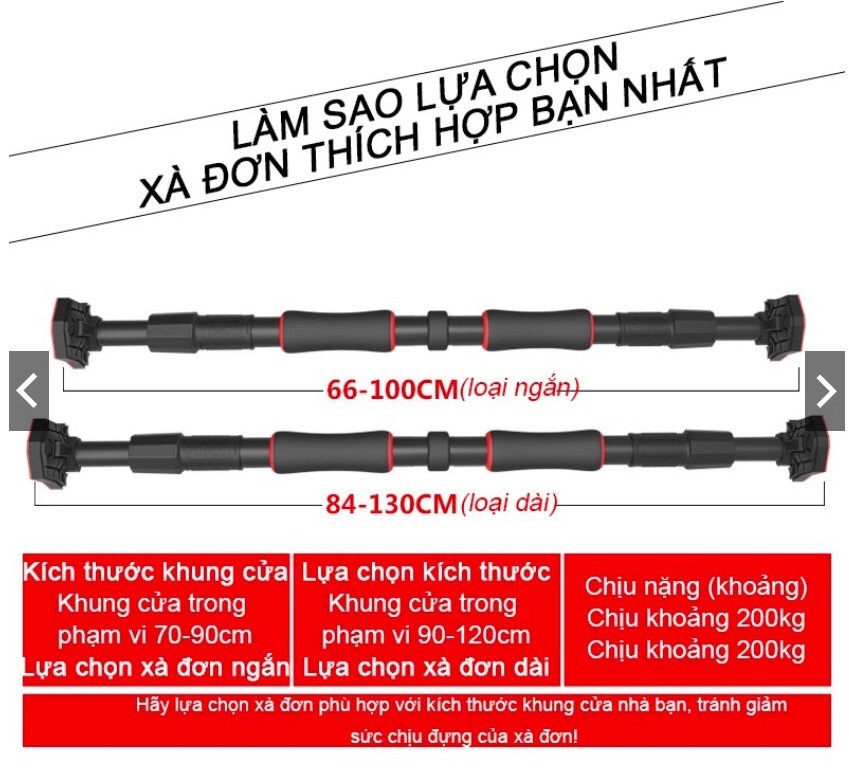 Mô Tả Sản Phẩm: Xà đơn gắn cửa cải tiến có chốt chống xoay (60cm-100cm)(82cm-130cm)(116cm-150cm) (Khách lựa chọn kích thước) Xà đơn có chốt chống xoay: Chiều dài : 62-100cm 82-130cm và 100-150cm Mẫu 62-100cm