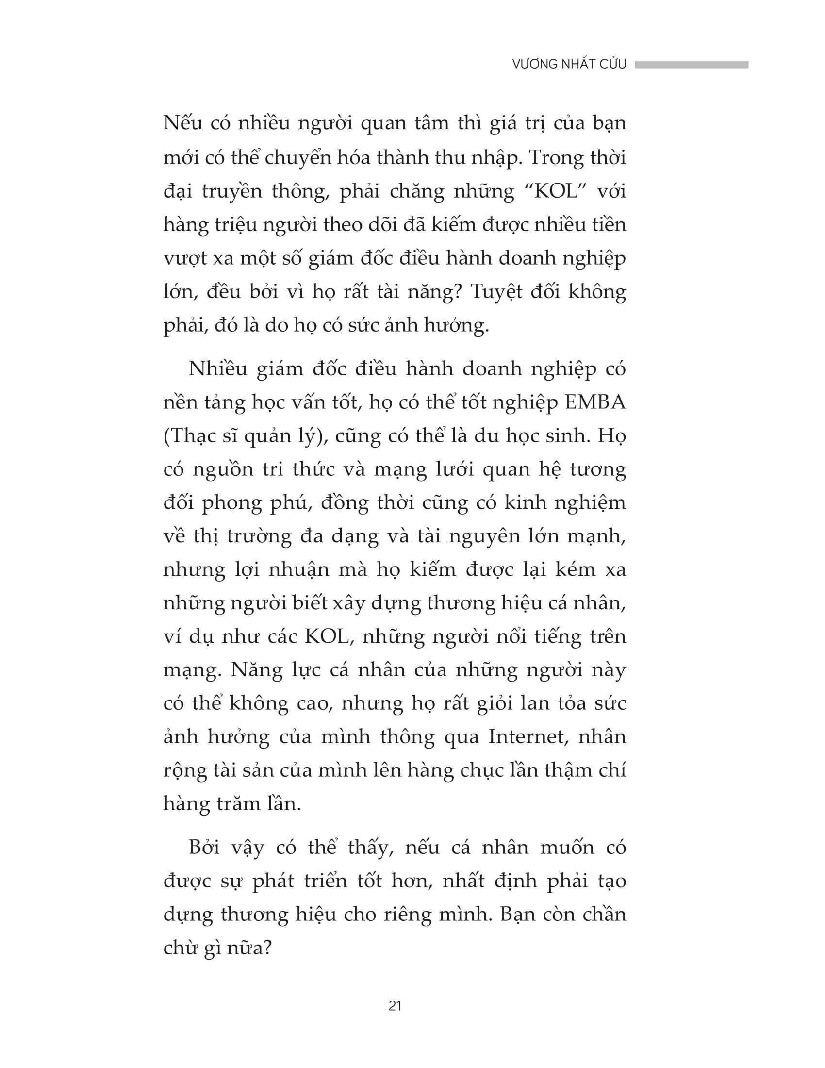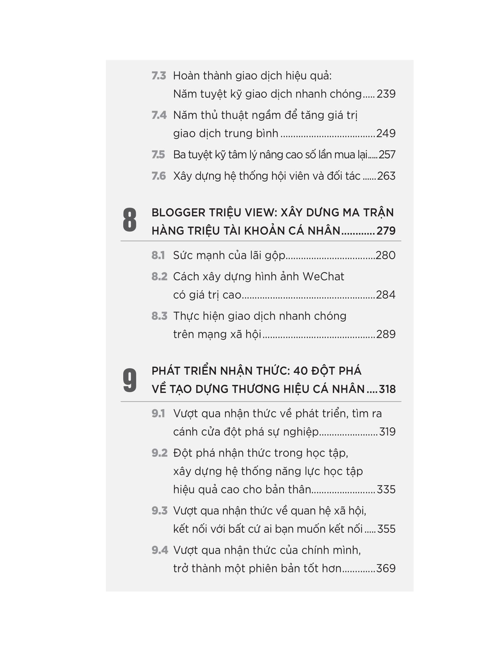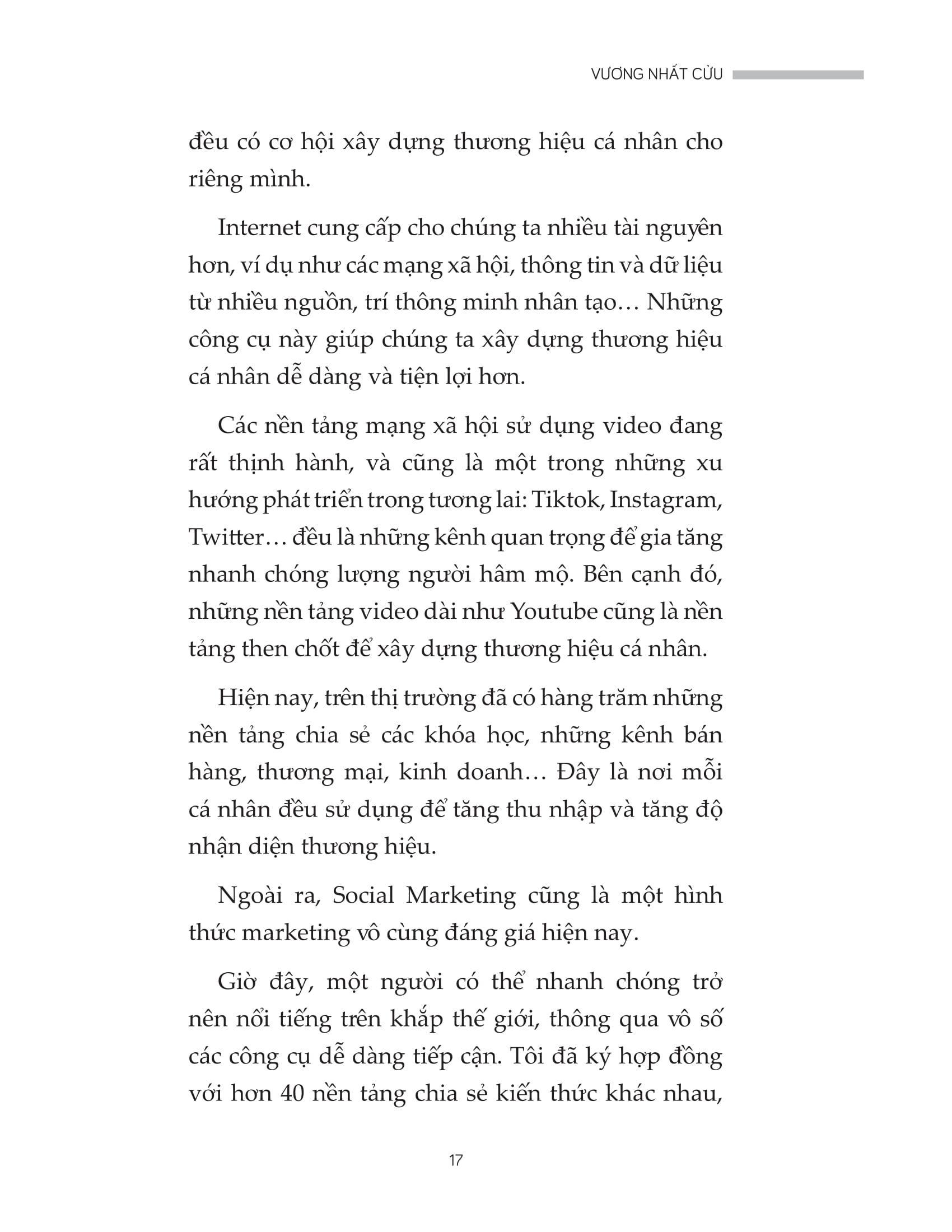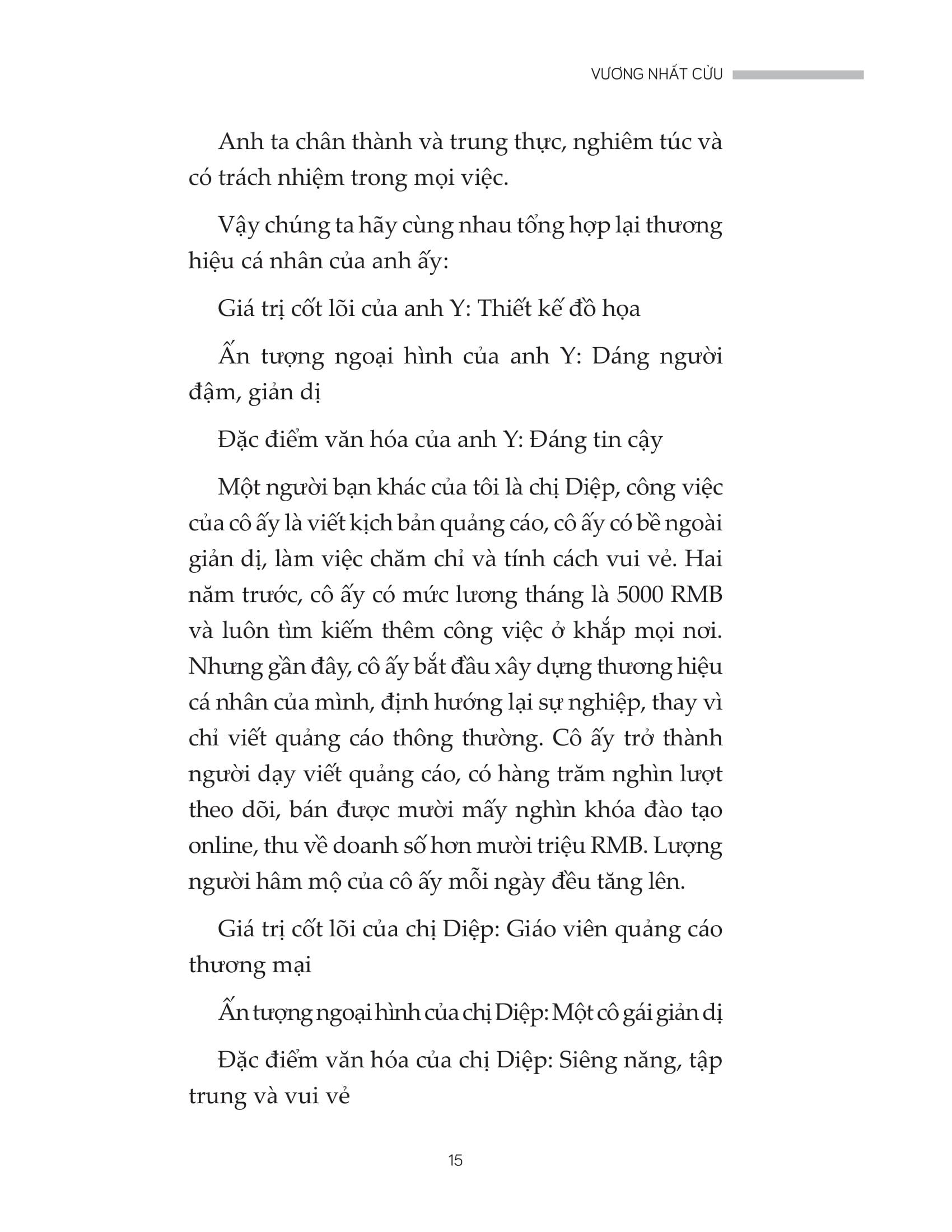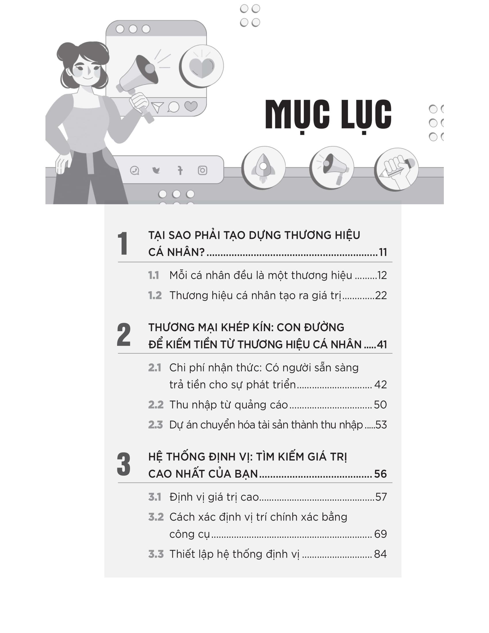 Cuốn sách được chia làm 8 chương sẽ giúp bạn đọc hiểu rõ về xây dựng thương hiệu cá nhân là cả một quá trình, và trong quá trình phát triển thương hiệu cá nhân sẽ giúp xác định đúng những thế mạnh, điểm yếu, kỹ năng,… của bản thân, để vận dụng những điều đó một cách hiệu quả hơn.