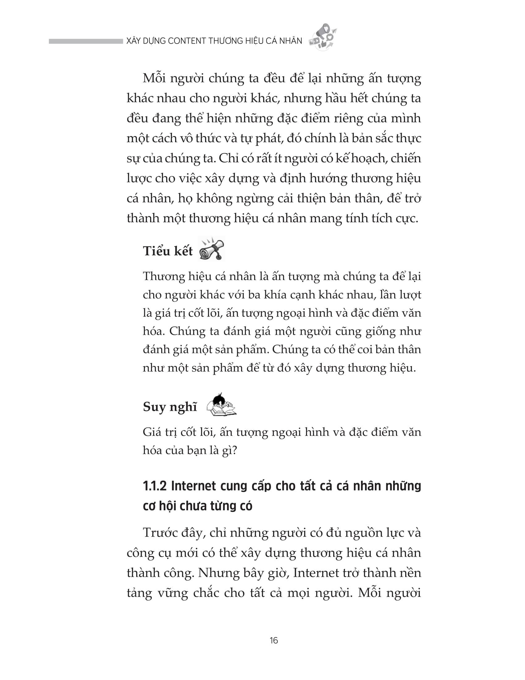 Ngày nay, xây dựng thương hiệu cá nhân đã và đang trở thành một yếu tố thiết yếu để đạt tới một sự thành công chuyên nghiệp. Nếu bạn băn khoăn tại sao phải xây dựng thương hiệu cá nhân thì cuốn sách: “ Xây dựng content thương hiệu cá nhân” sẽ là lời là câu trả lời cho bạn.