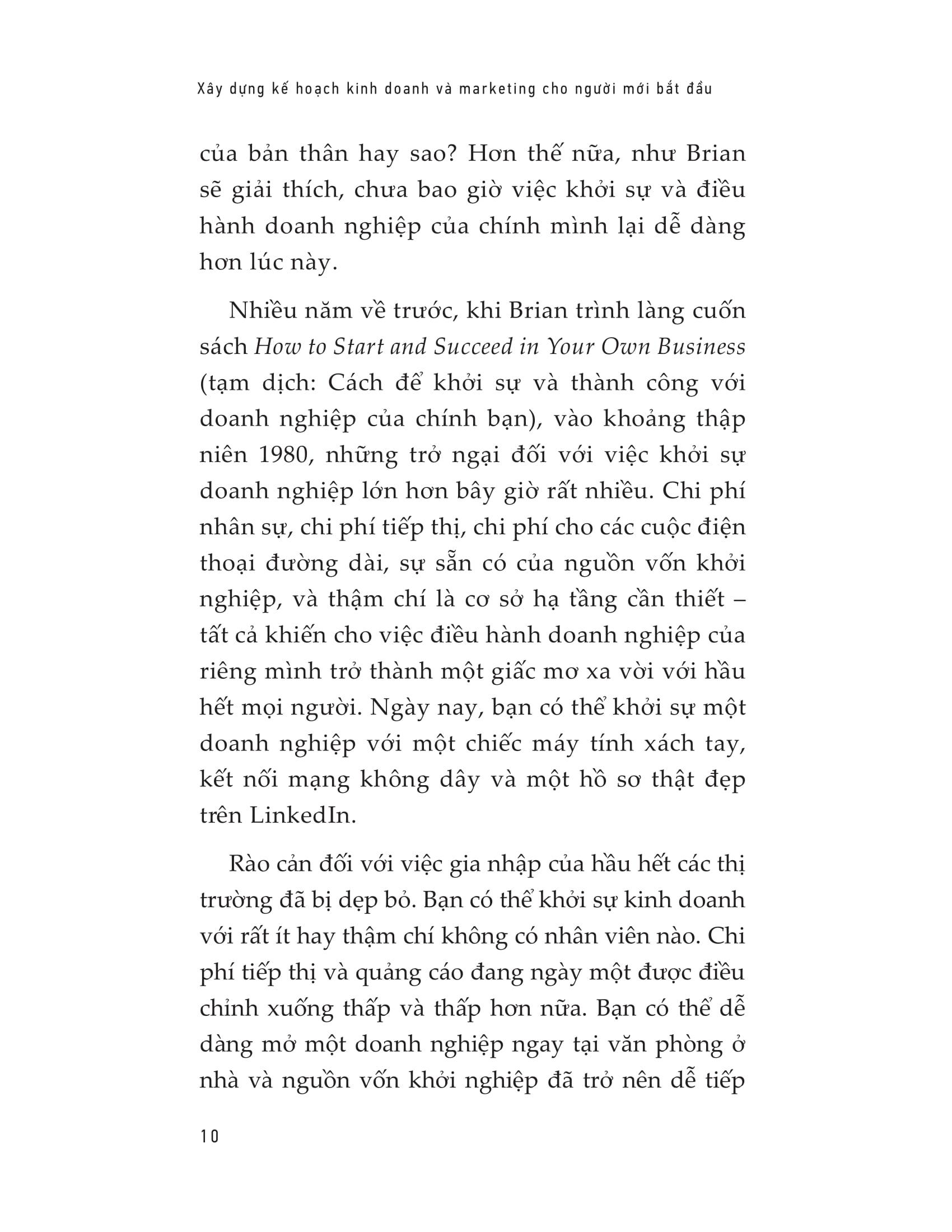 Trong cuốn sách « Xây dựng kế hoạch kinh doanh và marketing cho người mới bắt đầu », Brian sẽ giúp bạn nắm vững những ý niệm hay nhất về thành công cá nhân, giàu có, hạnh phúc và viên mãn; đồng thời giúp bạn tiếp xúc với các ý tưởng sáng tạo nhất, thịnh hành nhất và quan trọng hơn cả là đã được chứng minh về phương pháp để trở nên thành công.
