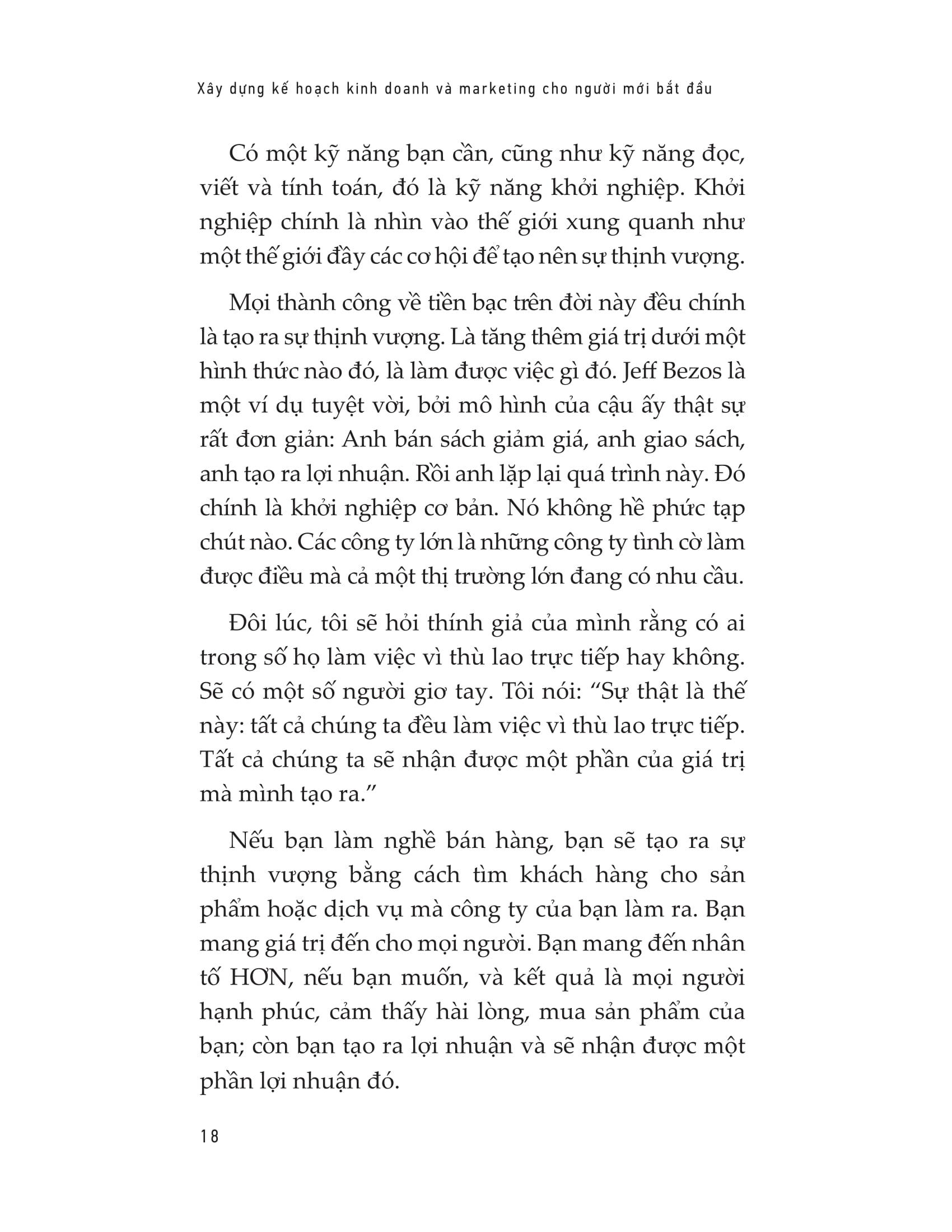 Có một kỹ năng bạn cần, cũng như kỹ năng đọc, viết và tính toán, đó là kỹ năng khởi nghiệp. Khởi nghiệp chính là nhìn vào thế giới xung quanh như một thế giới đầy các cơ hội để tạo nên sự thịnh vượng. Mọi thành công về tiền bạc trên đời này đều chính là tạo ra sự thịnh vượng. Là tăng thêm giá trị dưới một hình thức nào đó, là làm được việc gì đó. Việc của bạn là tìm ra công thức thành công. Bạn sẽ thử nghiệm bằng phương pháp thử và sai, bạn sẽ hỏi mọi người rất nhiều câu hỏi, bạn đọc và nghiên cứu, và bạn sẽ không ngừng trở nên giỏi hơn. Tất cả mọi công thức thành công đều có thể học được. Bạn có thể học được bất cứ thứ gì mình cần học.