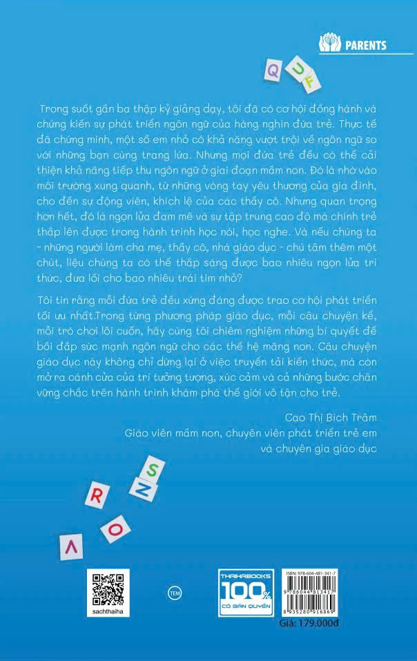 Cuốn sách là một hướng dẫn toàn diện về phát triển ngôn ngữ cho trẻ từ 0 đến 6 tuổi dành cho cha mẹ, giáo viên và người chăm sóc trẻ, được xây dựng bởi cô Cao Thị Bích Trâm - giáo viên mầm non, chuyên gia giáo dục và chuyên viên phát triển trẻ em.