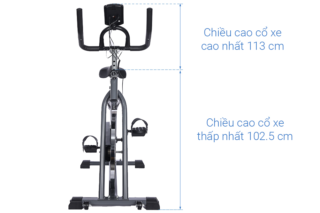 Trọng lượng tối đa người sử dụng: 125kg Cốt thanh tay cầm và yên xe bằng crom Màn hình LED hiển thị trực quan, dễ dàng quan sát Trang bị giá đựng chai nước và