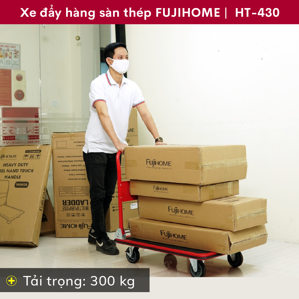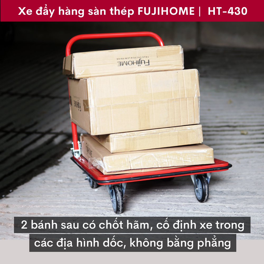 - Công nghệ Nhật Bản, xuất xứ chính hãng. Xe đẩy hàng sàn thép 4 bánh FUJIHOME HT-430 ƯU ĐIỂM VƯỢT TRỘI: - Tải trọng lên tới 300kg giúp vận chuyển được khối lượng hàng hóa lớn mà không tốn quá nhiều công sức và nhân lực.