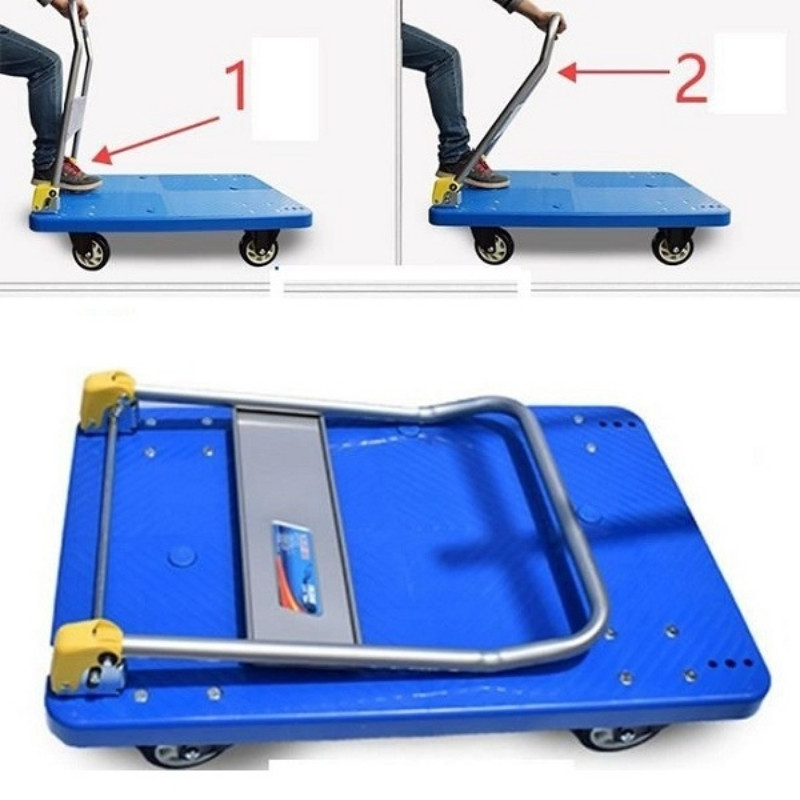 Xe được ứng dụng để chở hàng hóa, chở tiền Kiểu xe: xe đẩy sàn nhựa gấp gọn Kích thước : 600 x 900 x 860mm Đường kính bánh xe: 125mm Tải trọng: 300kg Trọng