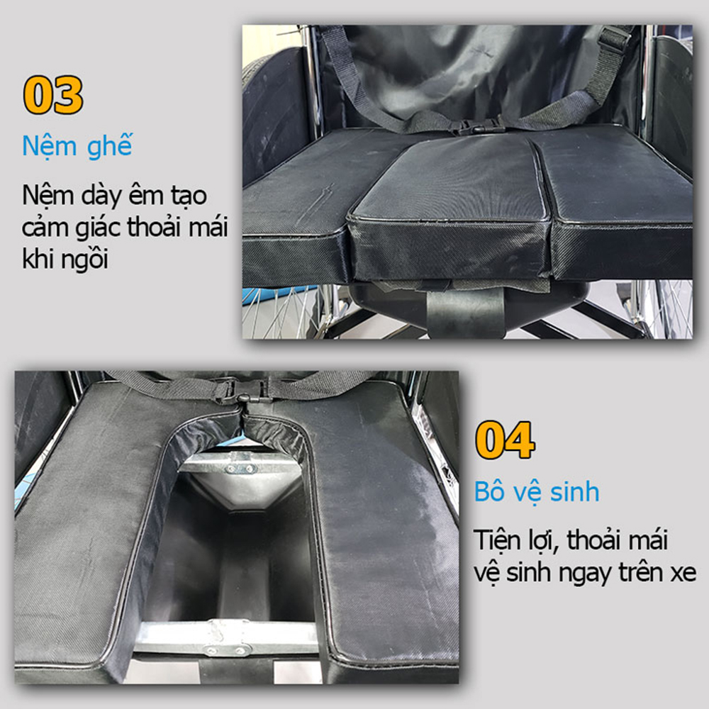 - Là mẫu xe lăn có đệm, kèm bô vệ sinh, còn có thêm 2 miêng lót tựa lưng và lót đệm ngồi tổ Ong thoáng khí, có thể tháo rời ra để vệ sinh làm sạch khi cần, đặc biệt thiết kế các lỗ tổ Ong thoáng khí nên rất nhanh khô sau khi giặt sạch