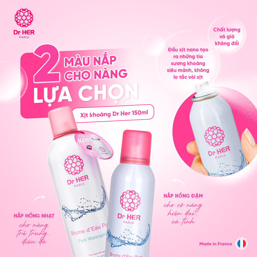 Xịt khoáng cấp ẩm Dr HER Paris_400ML Xịt khoáng Dr HER Paris xuất xứ từ Pháp với điểm nổi bật là công nghệ đầu xịt Nano mới nhất năm 2020, tạo ra các tia sương khoáng nhỏ liti chứa Nitrogen siêu mát lạnh, giúp cấp ẩm tức thì, mang đến cho bạn làn da tươi mới, tràn đầy sức sống. Xịt khoáng Dr HER Paris với thành phần 100% từ thiên nhiên kết hợp cùng công nghệ sản xuất đạt chuẩn Châu Âu đang trở thành sản phẩm chăm sóc da lý tưởng, không thể thiếu của phái đẹp hiện nay. Công dụng: