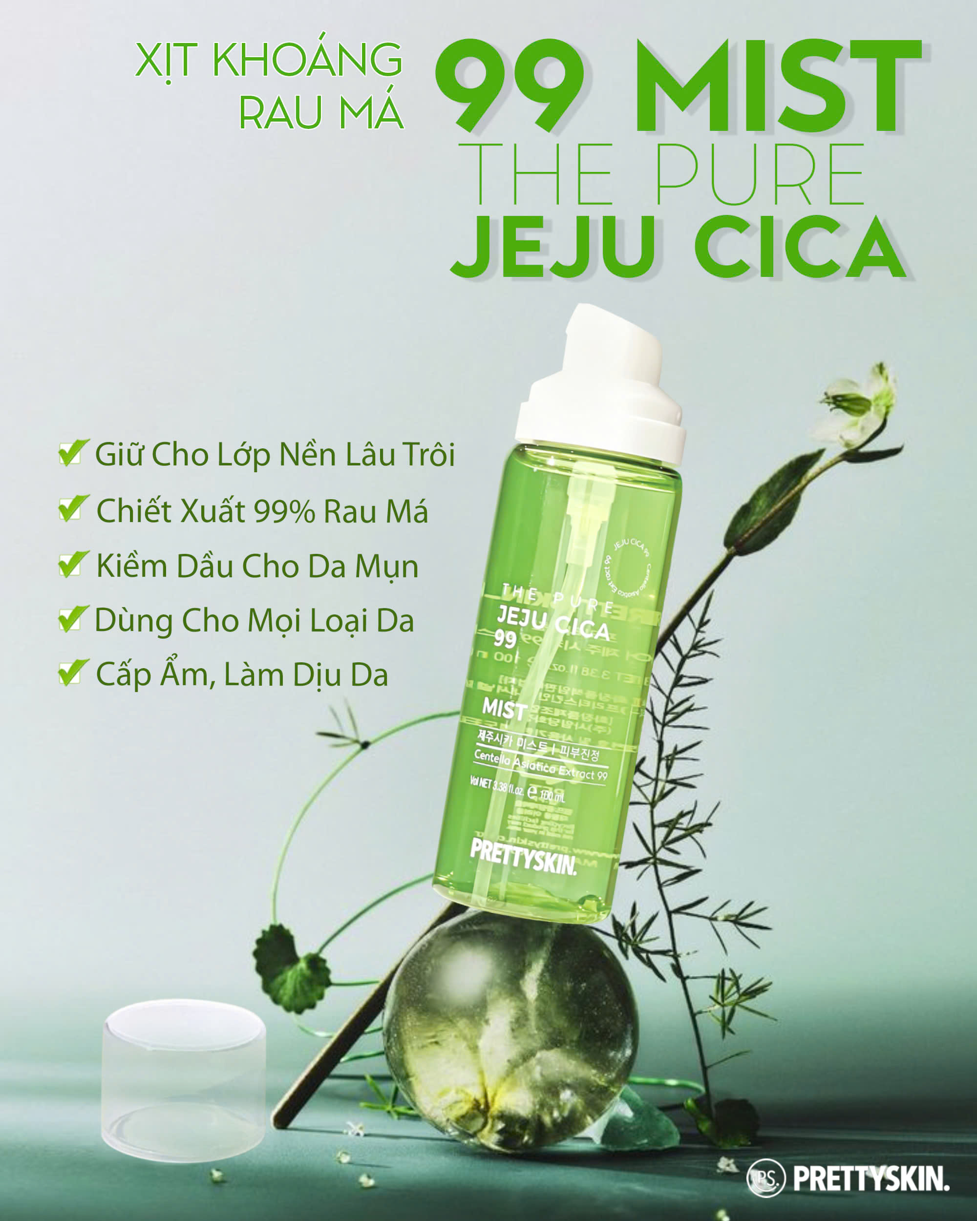 Xịt khoáng rau má Pretty Skin The Pure Jeju Cica 99 Mist làm dịu cấp ẩm cho da Xuất xứ: Hàn Quốc. Thương Hiệu: Prettyskin. Dung tích: 100ml. Phù hợp: Mọi loại da, đặc biệt