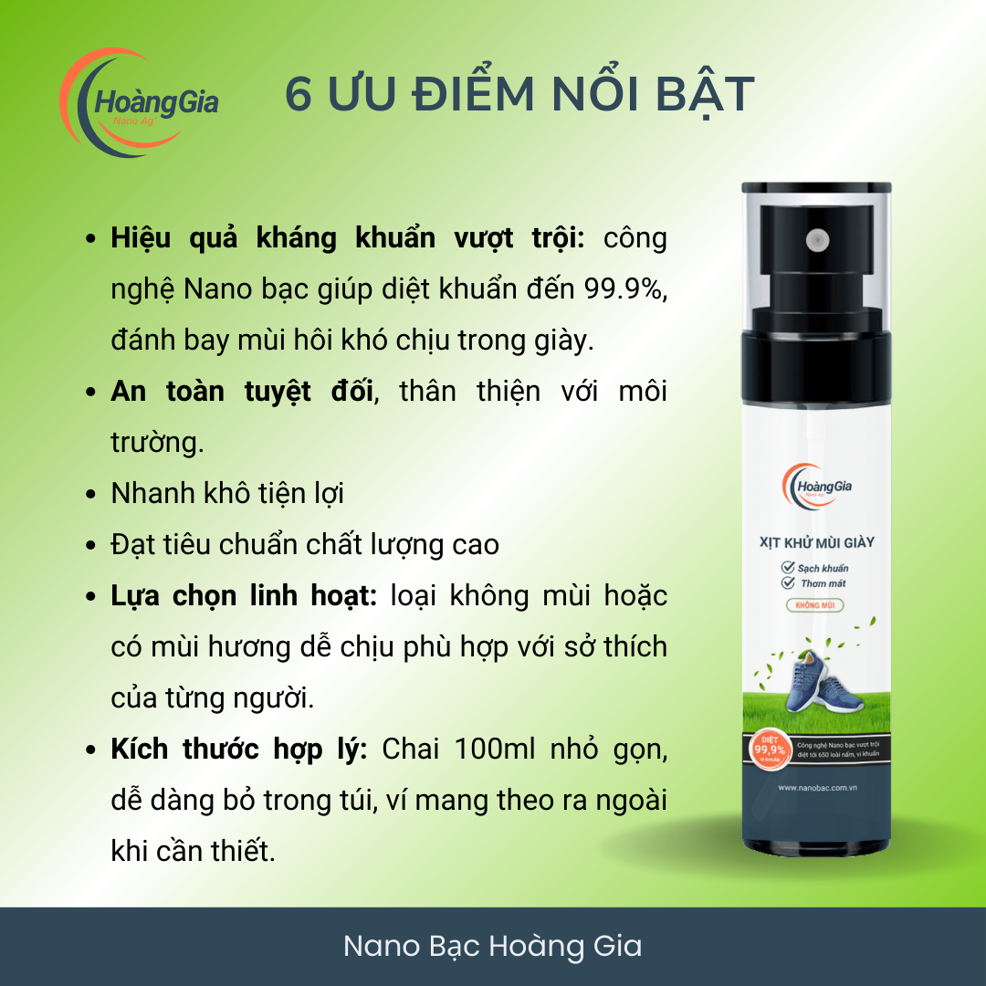 ƯU ĐIỂM NỔI BẬT: Hiệu quả kháng khuẩn vượt trội: Sử dụng công nghệ Nano bạc kích thước 20nm giúp diệt khuẩn đến 99.9%, đánh bay mùi hôi khó chịu trong giày. An toàn tuyệt đối: Không làm hỏng chất liệu giày, an toàn cho người sử dụng và thân thiện với môi trường. Nhanh khô tiện lợi: Xịt xong có thể sử dụng ngay mà không cần đợi lâu. Đạt tiêu chuẩn chất lượng cao: Được sản xuất với quy trình nghiêm ngặt, đảm bảo chất lượng và độ tin cậy. Lựa chọn linh hoạt: Có hai phiên bản: không mùi tự nhiên hoặc có mùi hương dễ chịu phù hợp với sở thích của bạn. Kích thước hợp lý: Chai có dung tích 100ml cầm rất thuận tay và dễ dàng mang theo ra ngoài khi cần thiết.