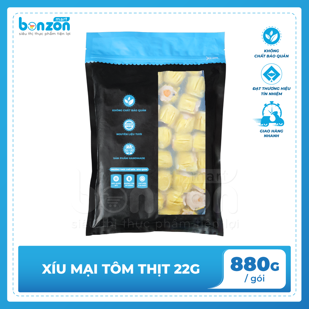 Với sản phẩm tươi sống, trọng lượng thực tế có thể chênh lệch khoảng 10%. ĐỊNH LƯỢNG: 22g/cái x 40 cái/gói THÀNH PHẦN: Vỏ bột xíu mại, thịt heo, tôm, nấm đông cô, mỡ thắng, gia