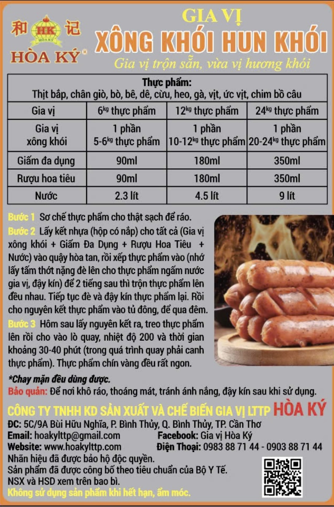Gia vị Xông Khói - Hun Khói là sản phẩm trộn sẵn vừa vị hương khói, được sử dụng để ướp làm món xông khói cho các loại thực phẩm như bắp, chân giò, thịt bò, bê, dê, cừu, heo, gà, vịt, ức vịt, lưỡi heo, lưỡi bò, chim bồ câu, xúc xích. Sản phẩm bao gồm: Gia vị xông khói trộn sẵn, Giấm đa dụng, Rượu hoa tiêu và Nước.