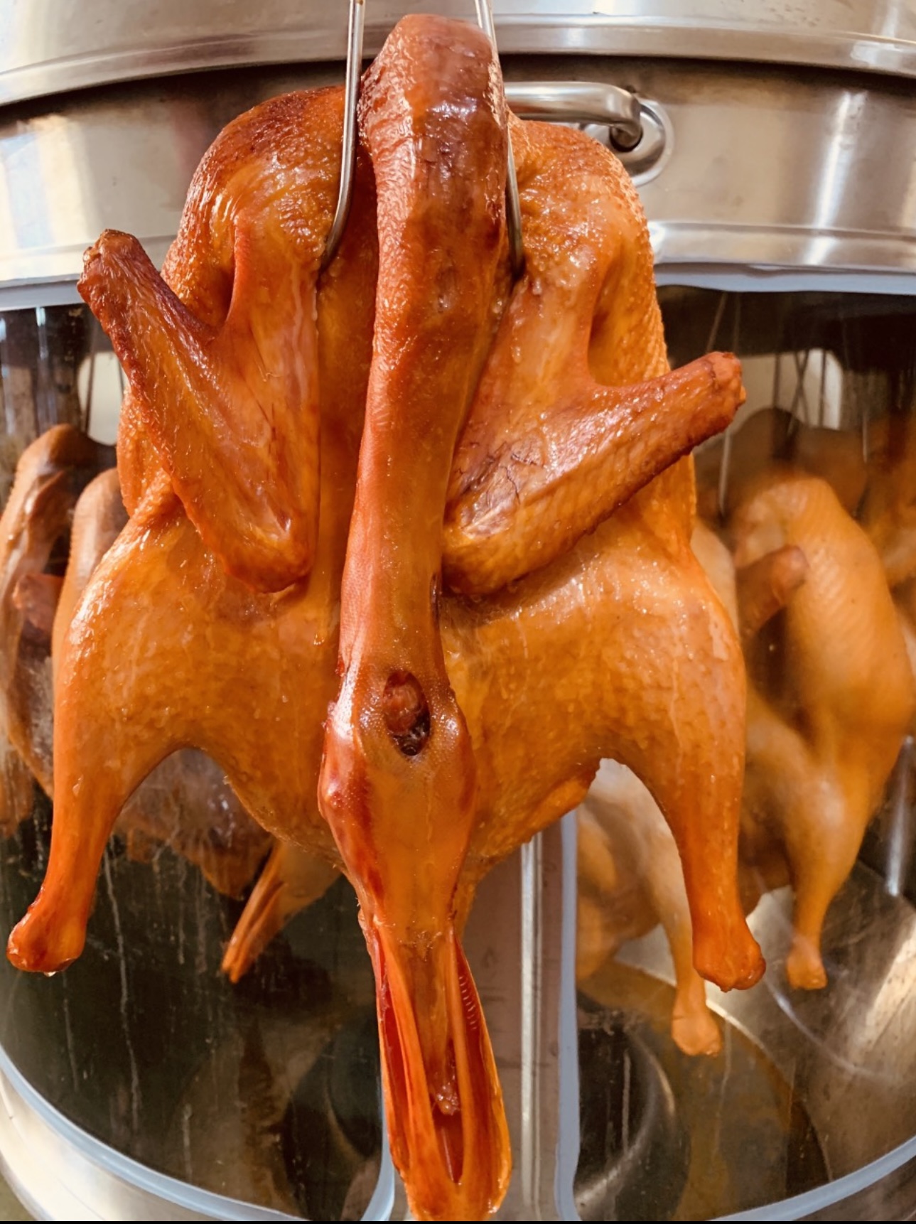 Hôm sau lấy nguyên kết ra, treo thực phẩm lên rồi cho vào lò quay, nhiệt độ 200 và thời gian khoảng 30-40 phút (trong quá trình quay phải canh thực phẩm). Thực phẩm chín vàng đều rất ngon.