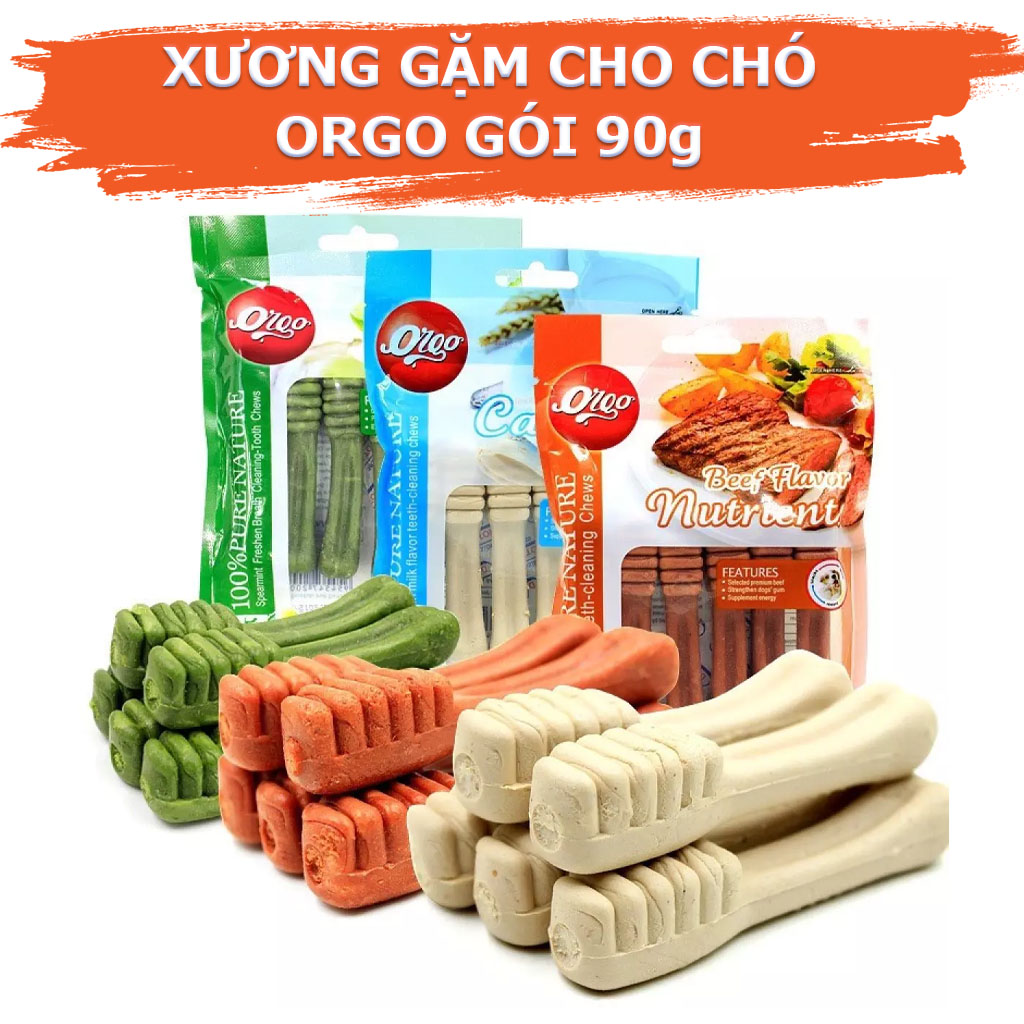 Xương Gặm Orgo Sạch Răng, Thơm Miệng, Bổ Sung Canxi Cho Chó Thông tin sản phẩm: Xương gặm Orgo có 4 hương vị: - Xương thịt bò: Chứa các thành phần thịt bò tự
