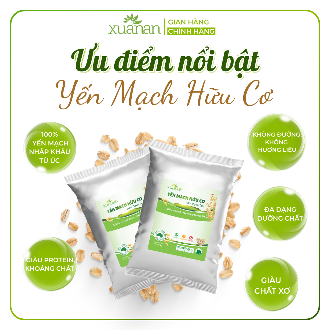 YẾN MẠCH HỮU CƠ – 100% ORGANIC ROLLED OATS – TÚI 5 KG Yến Mạch Hữu Cơ là loại ngũ cốc giàu chất xơ, đạm, vitamin và dưỡng chất tự nhiên. Được mệnh danh là Vua của Ngũ cốc. 100% Yến Mạch Hữu Cơ Xuân An được nhập khẩu từ ÚC. Thành phần : 100% Yến mạch hữu cơ nhập khẩu từ Úc. Không chất bảo quản, không hương liệu, không phụ gia. Yến mạch hữu cơ giúp giảm nguy cơ tim mạch, tiểu đường, giảm lượng cholesterol xấu trong máu. Phòng tránh bệnh loãng xương, ung thư, béo phì, táo bón. Giúp tăng khả năng tập trung, tránh suy nhược thần kinh, cũng cố hệ miễn dịch. Yến mạch hữu cơ có khả năng chống viêm và làm lành các vết thương trên da. Mặt nạ yến mạch làm sạch da và mịn da, dưỡng chất saponin giúp chống lão hóa hiệu quả. Đối tượng sử dụng : Thích hợp với mọi lứa tuổi. Tốt cho người ăn kiêng, tiểu đường, béo phì và táo bón. Quy cách đóng gói: 5 kg / túi. Hướng dẫn sử dụng: Dùng ăn liền hoặc làm nguyên liệu chế biến bữa ăn trong gia đình. Pha 30 g yến mạch hữu cơ với 180 ml nước sôi, khuấy đều trước khi dùng. Có thể thêm đường, sữa (sữa bột, sữa tươi), hoặc trái cây tuỳ theo sở thích. Dùng nấu cháo: Đun sôi khoảng 250 ml nước (cho thịt, tôm, cá, hoặc lươn), nêm gia vị, sau đó cho 50g yến mạch, đun tiếp trong 3 phút rồi ăn. Bảo quản: Bảo quản nơi khô ráo, thoáng mát; tránh tiếp xúc trực tiếp với không khí và ánh nắng mặt trời. Thông tin cảnh báo: Không dùng khi sản phẩm bị rách, mốc hoặc đã hết hạn sử dụng. Sản phẩm của: Công ty TNHH Thực Phẩm Dinh Dưỡng Xuân An.